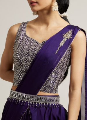 PRODUCT DETAILS ColourPurple MaterialVelvet Items IncludedLehenga , Blouse , Dupatta , Belt , Latkan Wash CareDry Clean Only DescriptionDainty fleur-de-lis