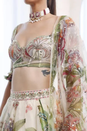 Printed embroidered blouse with lehenga and dupatta
