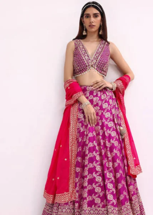 Purple And Pink Embroidered Silk Lehenga Choli Set