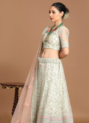 PRODUCT DETAILS Drape yourself in our Emerald Elegance Net Lehenga, a perfect blend of tradition and style. The lehenga features