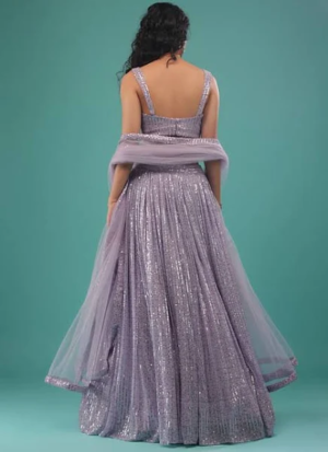 Color:Purple Fabric:Sequins Work:Sequins, Stone Neck Line:V-Neckline Sleeves:Sleeveless Can Can:Yes Pack Contains:1 Top, 1 Bottom, 1 Dupatta