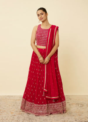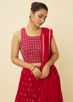 PRODUCT DETAILS ColourRed MaterialGeorgette WorkSequin Work, Zari, Embroidery Items IncludedTop , Dupatta , Lehenga Wash CareDry Clean Only DescriptionPaint a