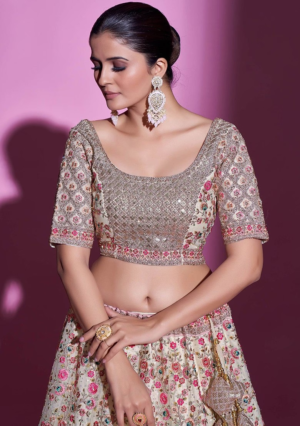 PRODUCT DETAILS Make a fashion statement in this cream Lehenga, featuring floral printed and sequin work on the top and