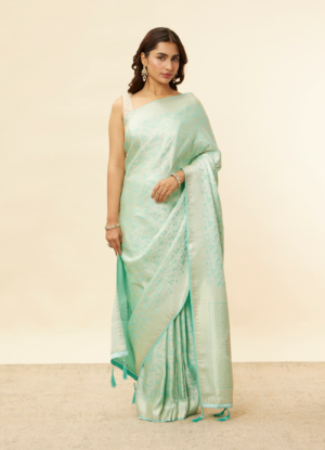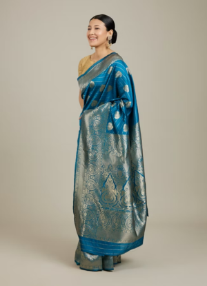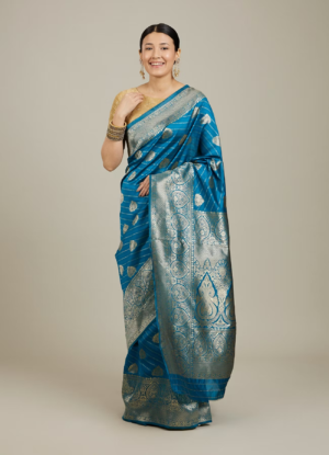 Turquoise Blue Floral Motifs in Zari Work Saree