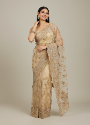 PRODUCT DETAILS ColourBeige MaterialNet WorkEmbroidery, Stone Work, Thread Work, Zari Items IncludedSaree , Unstitched Blouse Fabric Wash CareDry Clean Only