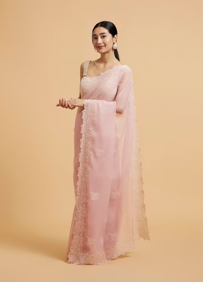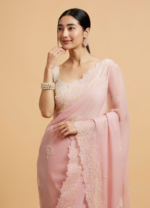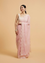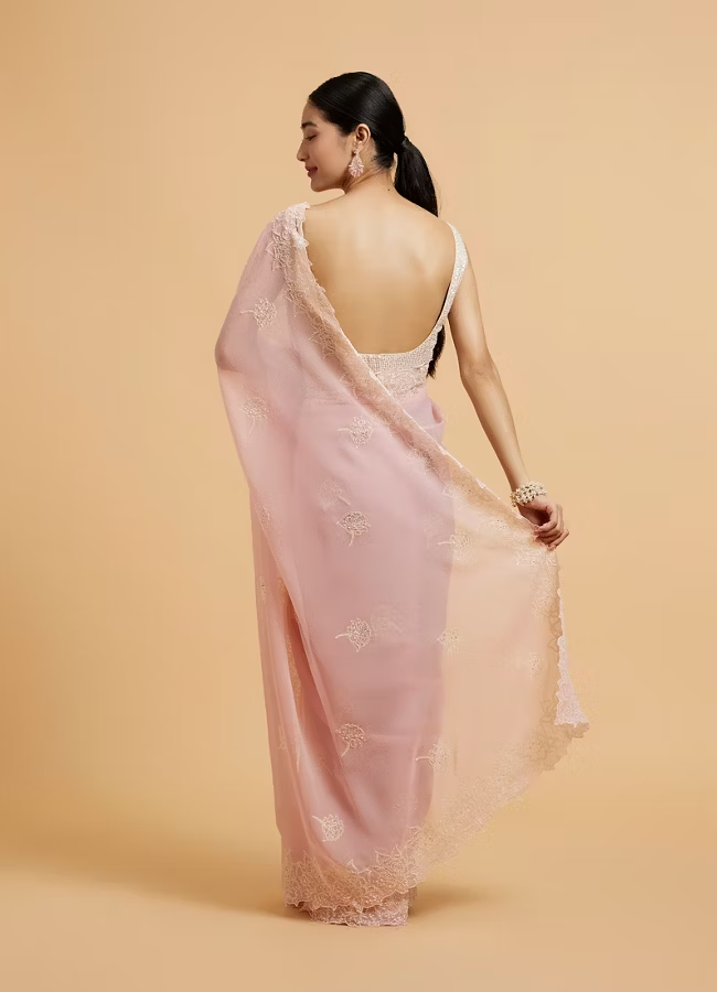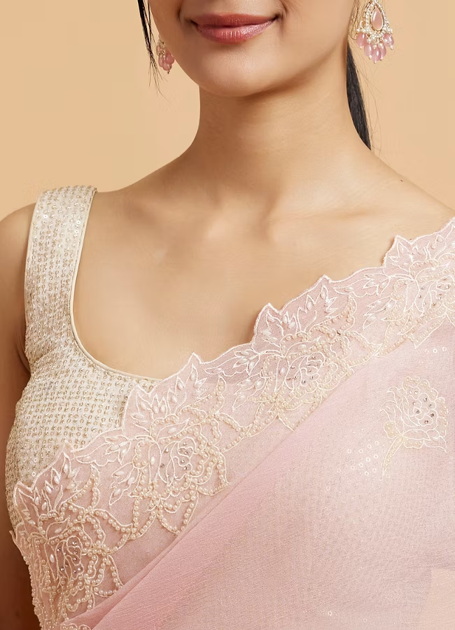 Baby Pink Floral Embroidered Saree with Pearl and Rhinestone Work