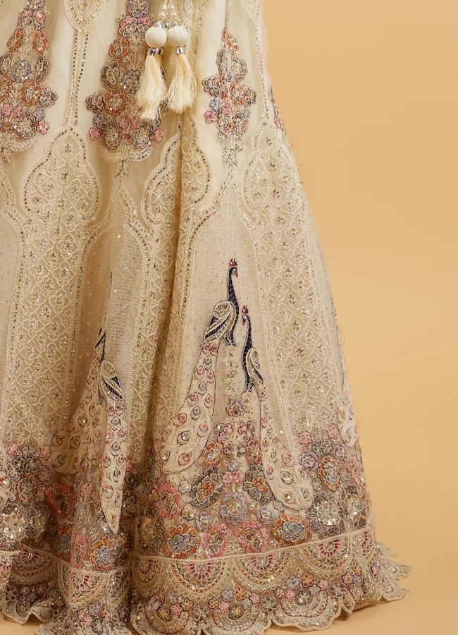 This elegant beige cream lehenga set exudes grace with its kali cut skirt adorned with sitara embroidery, showcasing intricate peacock and floral motifs, complemented by a floral buta pattern. Enhanced with stone work and round trim latkans, it pairs beautifully with a V-neckline blouse featuring floral embroidery in jaal pattern. A net dupatta with floral embroidered borders completes the ensemble. Accessorize with pearl drop earrings and a sleek updo to accentuate the neckline and detailed embroidery for a sophisticated look at any formal event.
