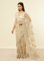• DescriptionThis saree in beige is meticulously adorned with floral bel embroidery, complemented by intricate stone and sequin work along the cut out border in grid pattern, offering a rich, dimensional look. Elevate this saree with diamond jewellery and embellished heels for a luxurious appearance at weddings or formal gatherings.