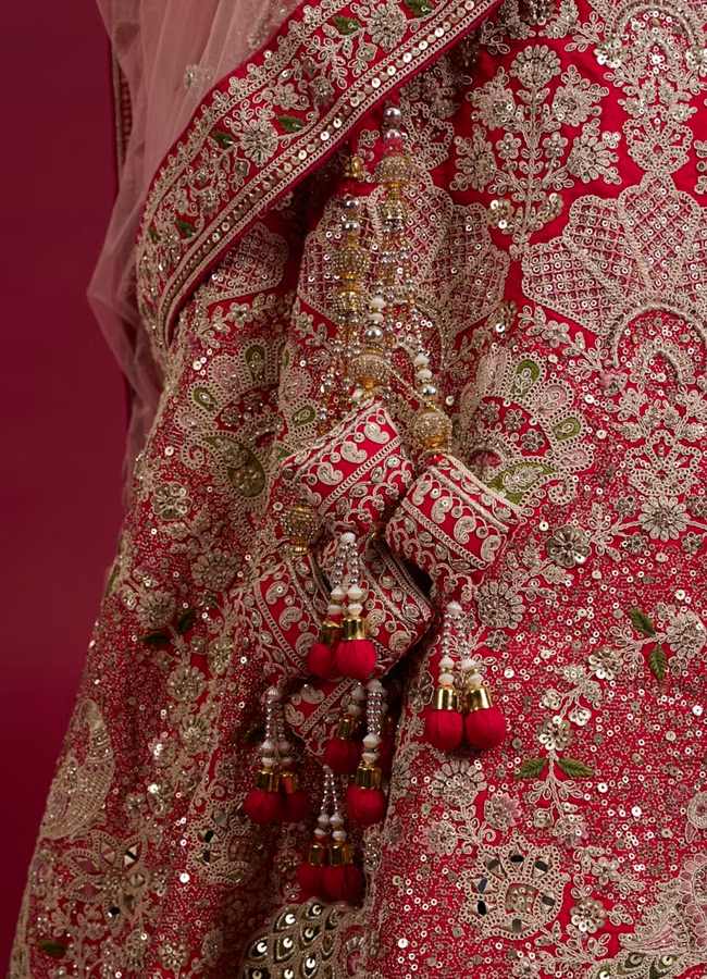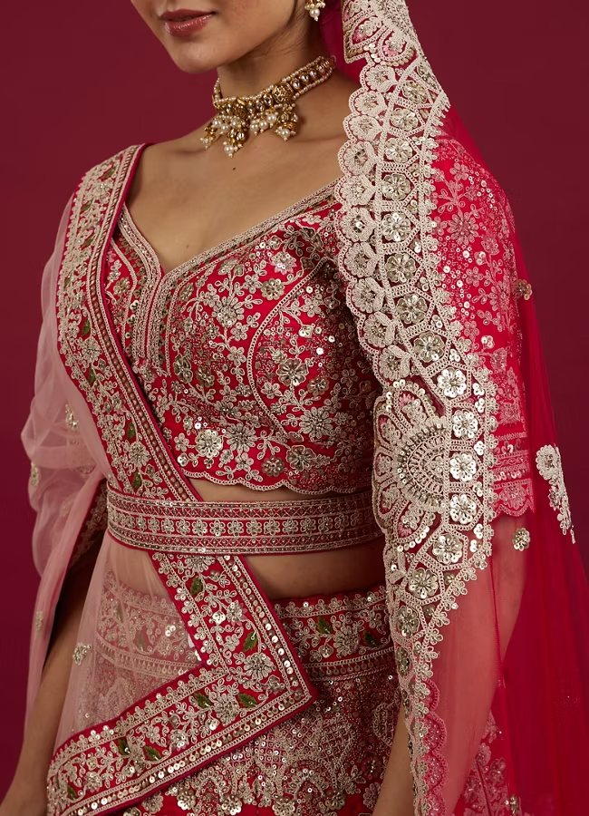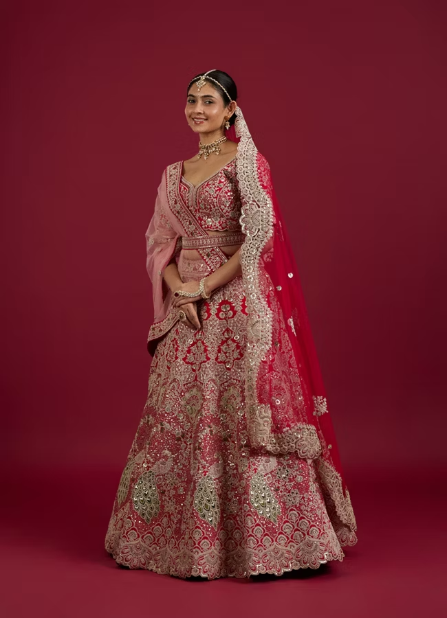 This berry pink lehenga showcases exquisite floral embroidery with sequin work highlights, featuring a kali cut ombre skirt with a scallop hem and pillow and tassel trim latkan. The set includes a matching embroidered blouse, waist belt, and a net dupatta with embroidered borders. Pair with gold jewellery and nude or gold strappy sandals to enhance the lehenga’s rich colours and details, perfect for celebrations or special events.