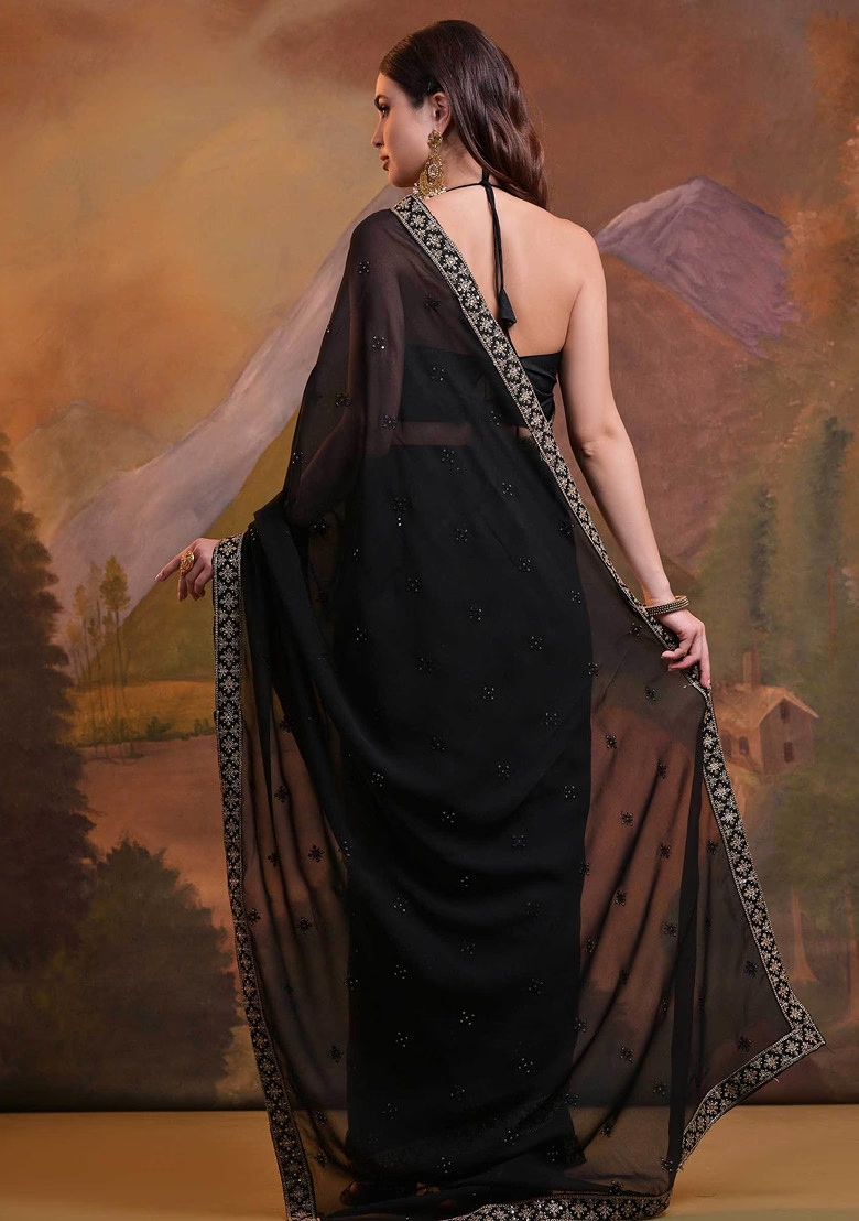 Black Sequin Embroidered Pure Georgette Saree Set