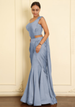 Blue Pre-Stitched Saree Set With Hand Emoridered Blouse