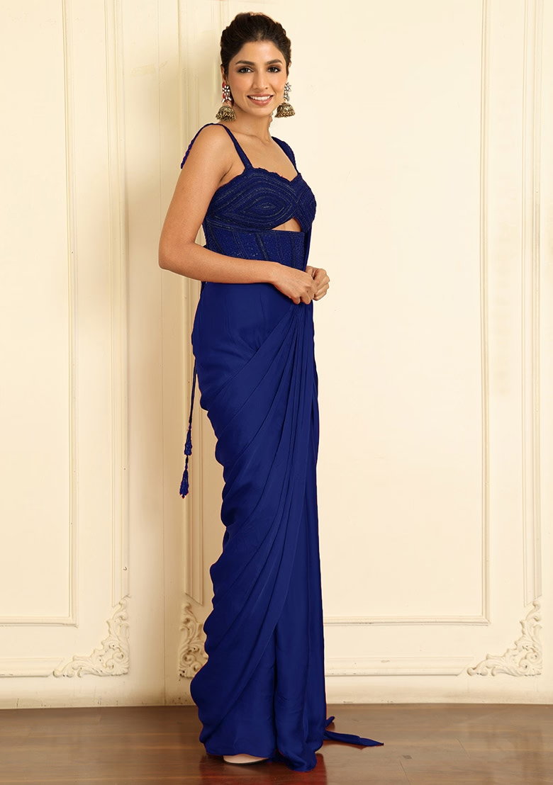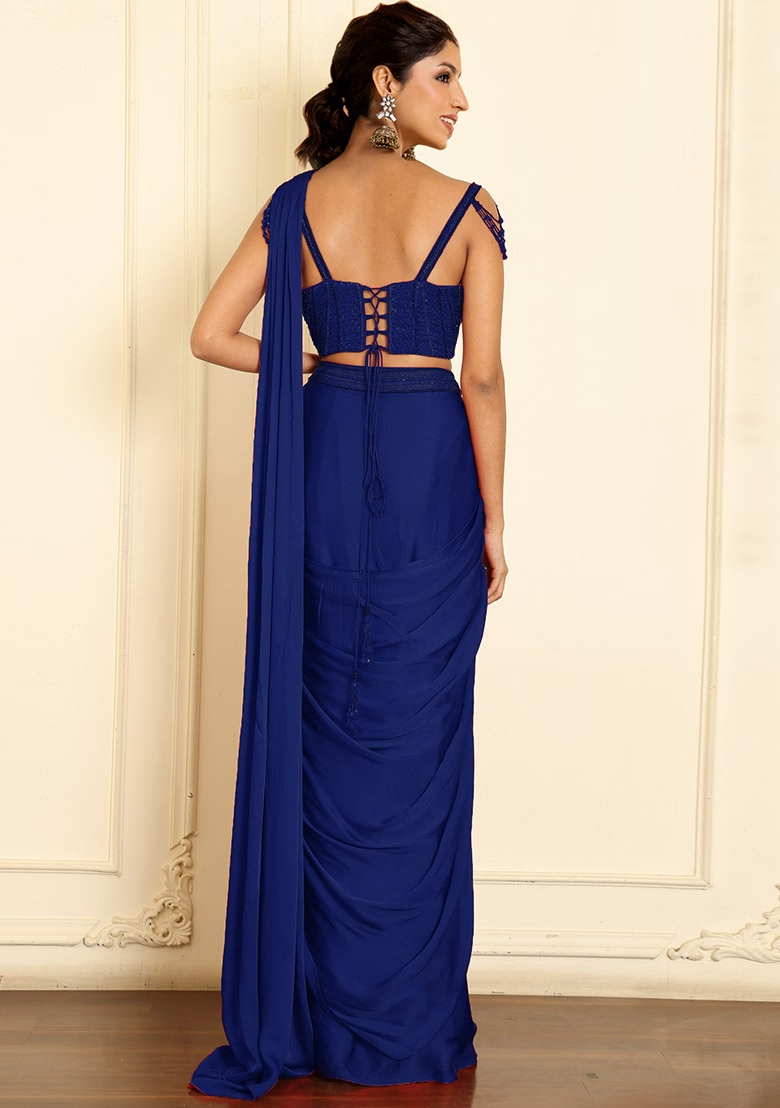 Blue Pre-Stitched Saree Set With Hand Emoridered Blouse