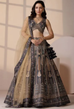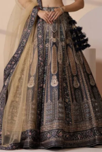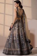 Featuring a blue lehenga in silk and net base with swarovski, cutdana, zircons, dori and sequins embellishments. It is paired with a blouse and a net dupatta. Accentuate with statement jewellery and heels for a wedding or sangeet ceremony.