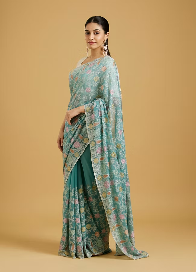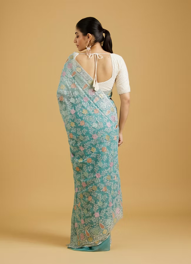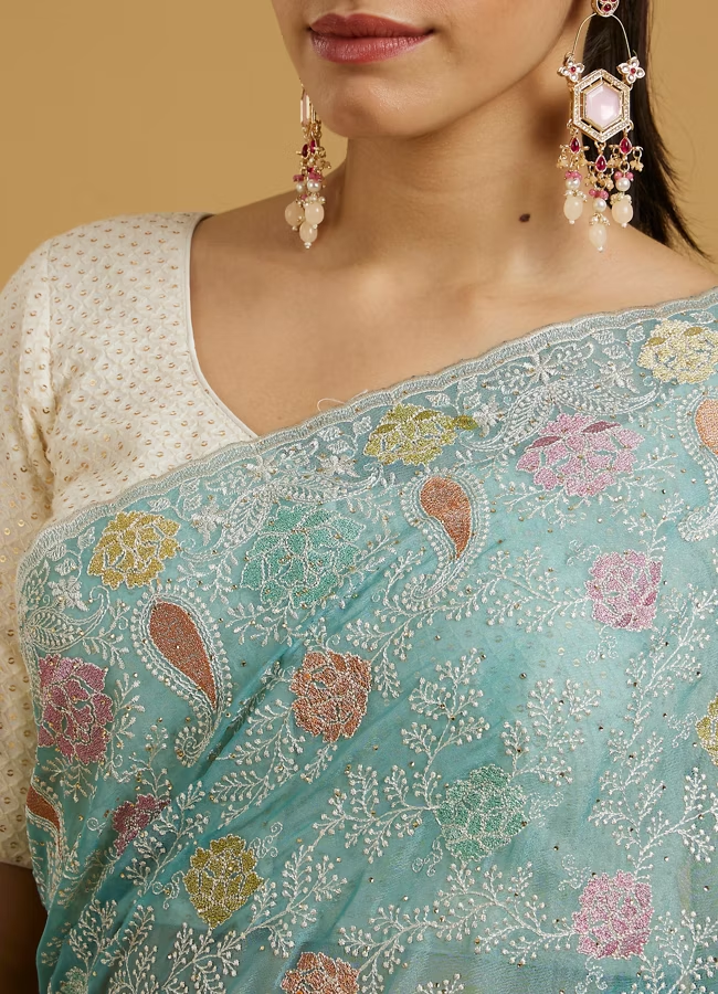 - DescriptionDelve into the elegance of this chic Light Blue Organza saree. Exuding an alluring charm, its soft colors and delicate fabric enhance your grace at every stride. Perfect for any special occasion or even a classy day out. The saree is your ideal companion to radiate a charismatic persona. Pair it with a contrasting blouse and traditional accessories for a complete look.