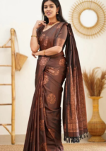 Be the first to review “Copper Brown Jacquard Banarasi Art Silk Saree Set” Cancel reply