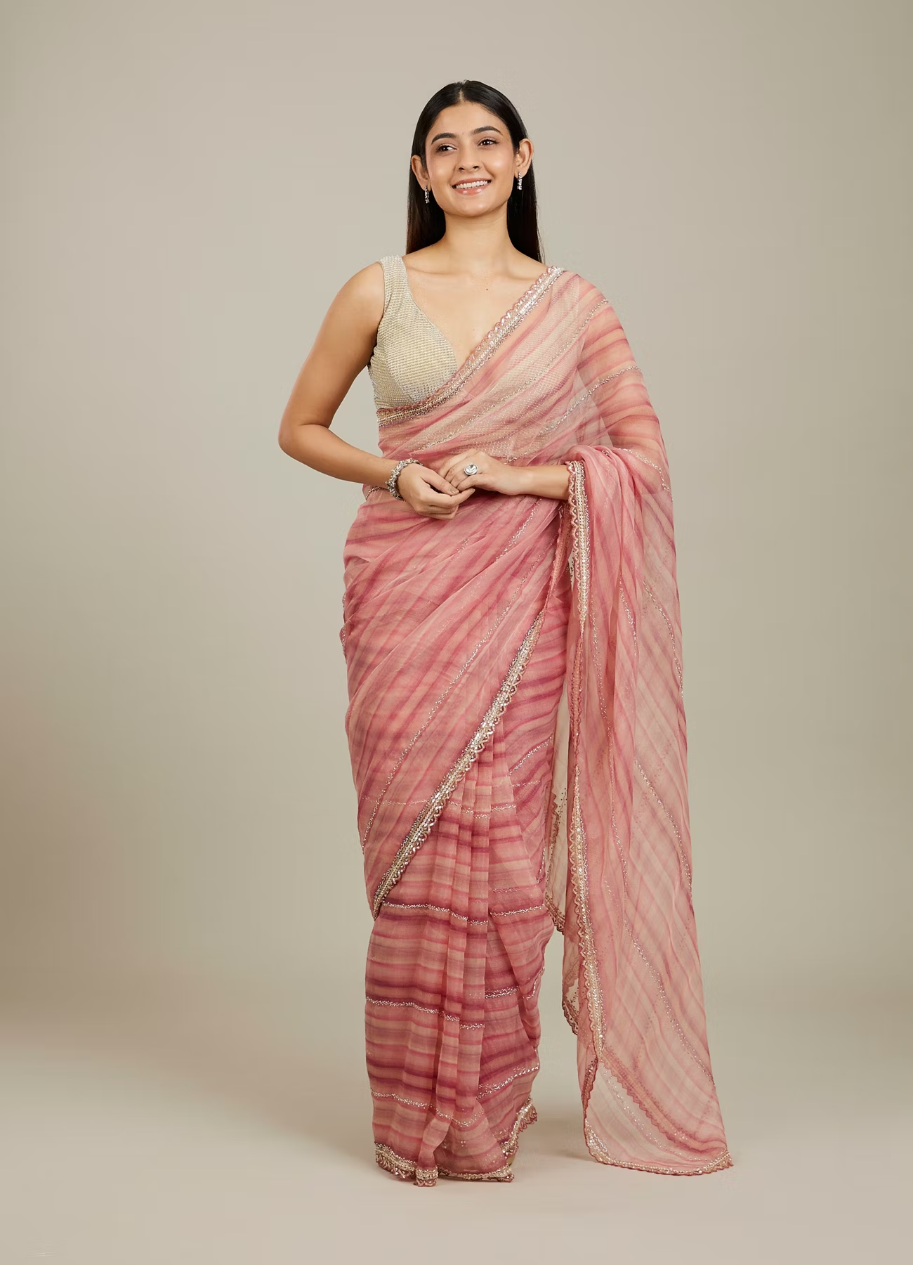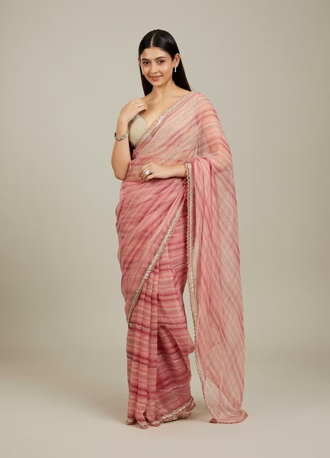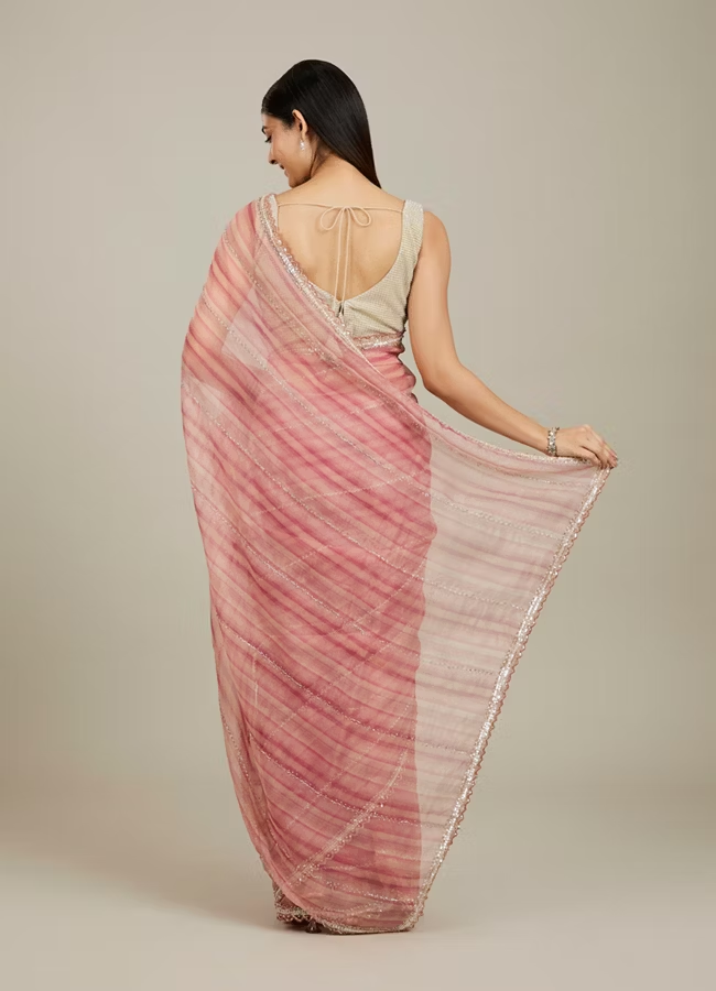 Coral Pink Diagonal Striped Saree with Cutdana And Sequin Work
