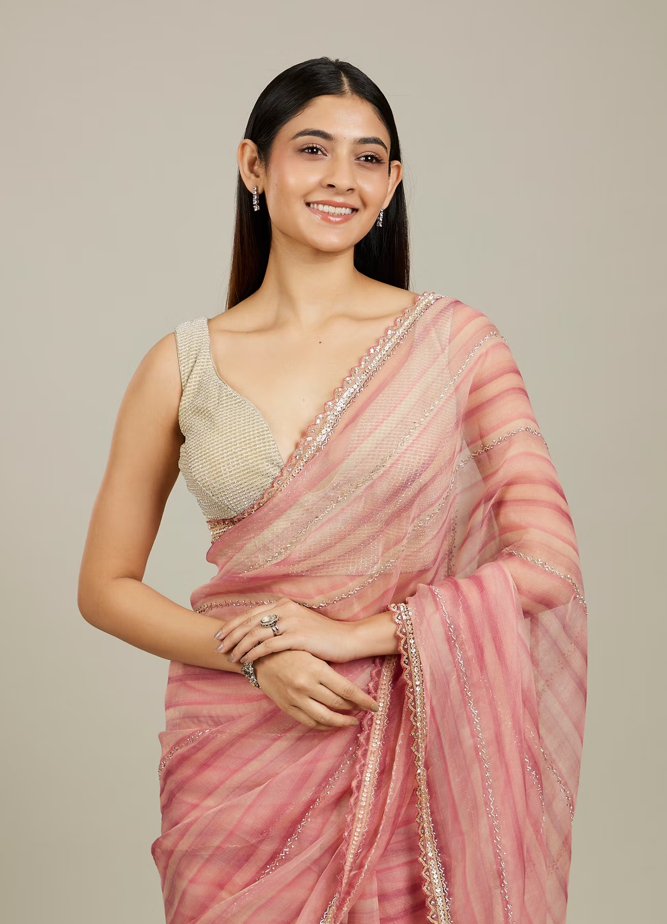 • DescriptionThis coral pink diagonal striped saree is a stunning fusion of contemporary design and traditional elegance. The bold diagonal stripes create a striking visual effect, while the cutdana and sequin work add a touch of sparkle and sophistication. Pair it with a metallic blouse and delicate jewelry to enhance the shimmer, creating a chic and radiant look.