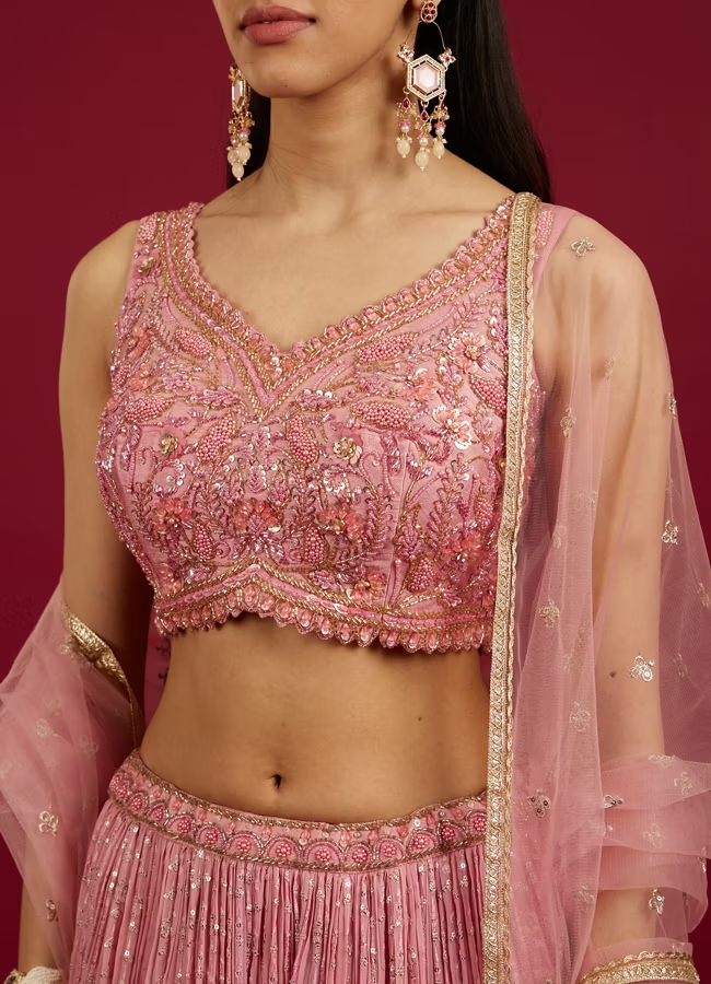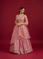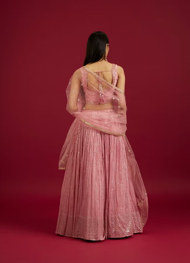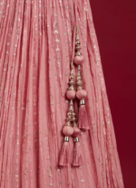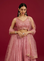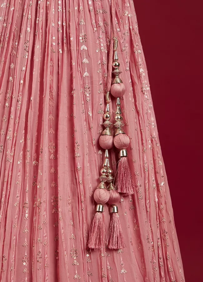 This Coral Pink sequin work foil print lehenga elegantly combines traditional sequin work on the sleeveless blouse with contemporary foil print featuring floral motifs and bel buti pattern on the plisse fabric skirt. The matching stole and potli trim latkans complete the ensemble, making it perfect for festive occasions where a blend of classic and modern styles is desired. Pair it with polki jewellery and golden heels.