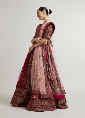 This cream colored lehenga set is a bohemian dream. The top and skirt boast a beautiful floral paisley print, offering a touch of vintage charm. The skirt’s playful round tassel trim, known as latkans, adds a touch of whimsy with every step. The top’s U-neckline keeps it cool and comfortable. To complete the ensemble, a matching net dupatta features dazzling sequin-worked borders that elevate the look. Embrace the carefree vibe with sandals and layered necklaces for a perfect summer festival outfit.