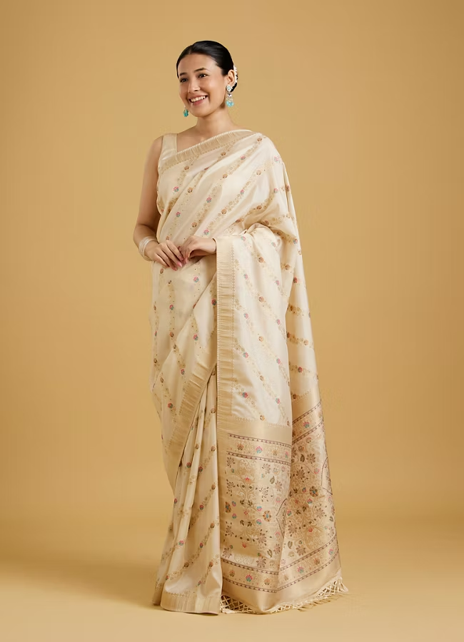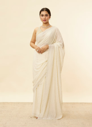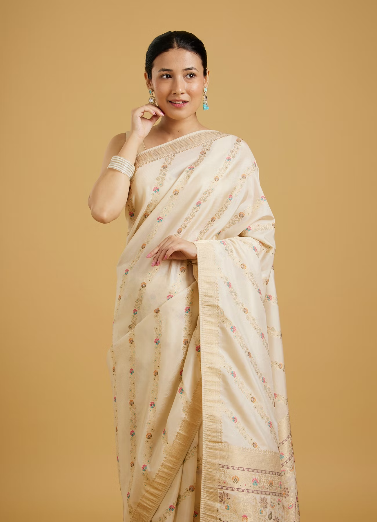 - DescriptionStep into the realm of timeless elegance with this Cream Radiant Elegance Saree. A beautiful blend of tradition and modernity, this saree is made of luxurious silk that softly drapes over your silhouette. Perfect for every special occasion, this saree celebrates the uniqueness of your style in a sublime way. Make an unforgettable impression wherever you go with this Cream Radiant Elegance Saree.