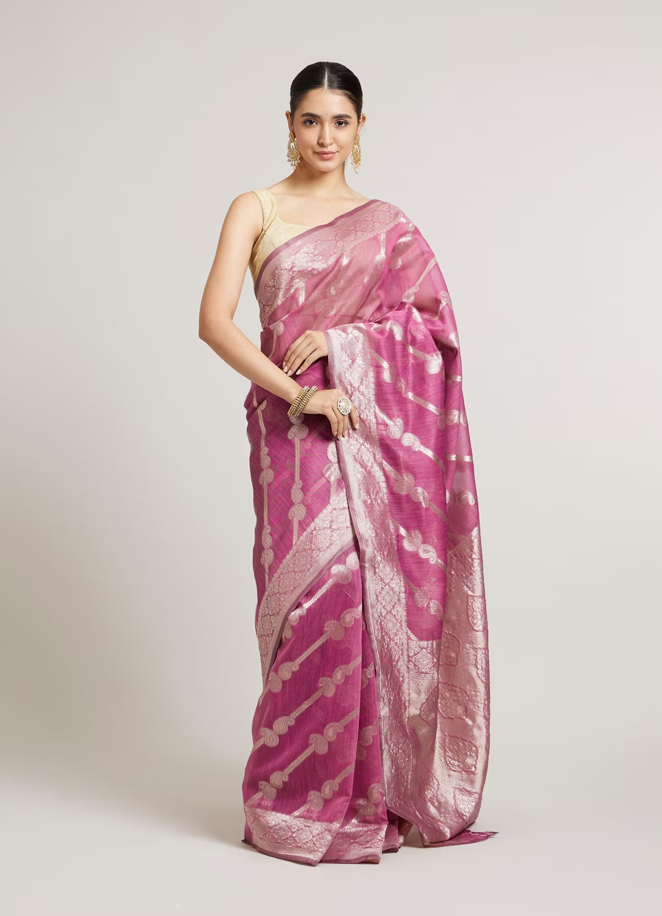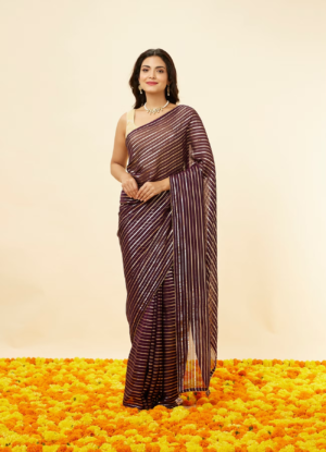 - DescriptionEmbrace sophistication with our damson purple striped patterned saree, featuring elegant paisley motifs that add a touch of artistry. Crafted from lightweight, breathable fabric, this saree drapes beautifully, ensuring comfort throughout the day. For an enchanting appearance, pair it with a contrasting blouse and statement accessories, allowing the paisley details to truly stand out.