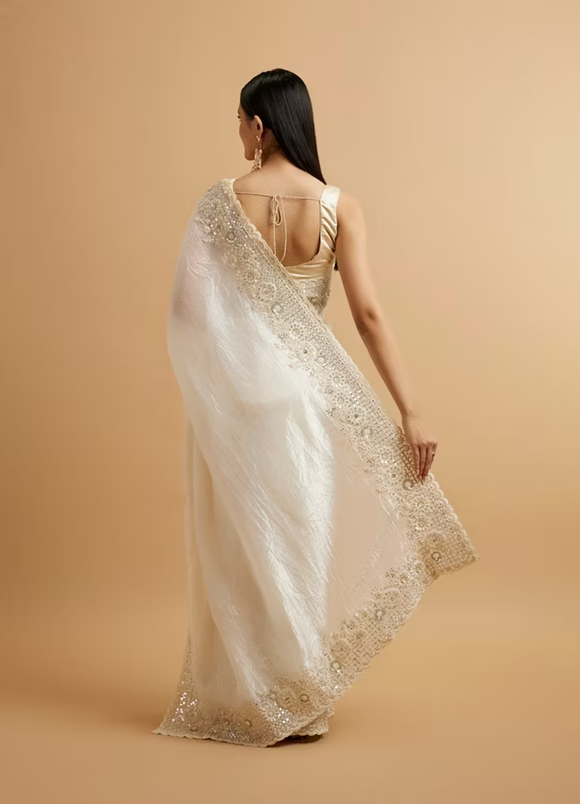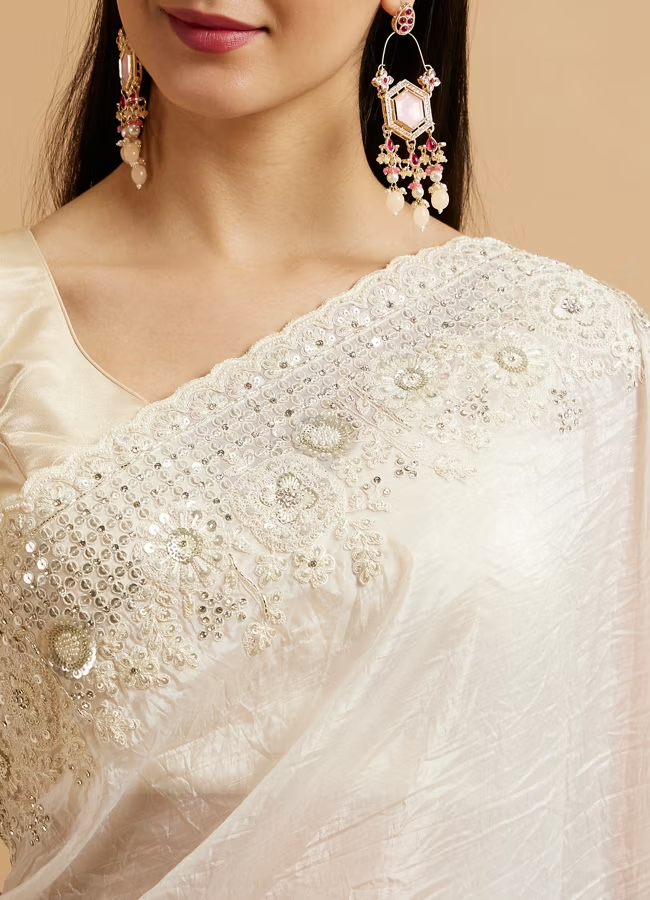 Dark Cream Bel Buti Patterned Stone Embellished Saree
