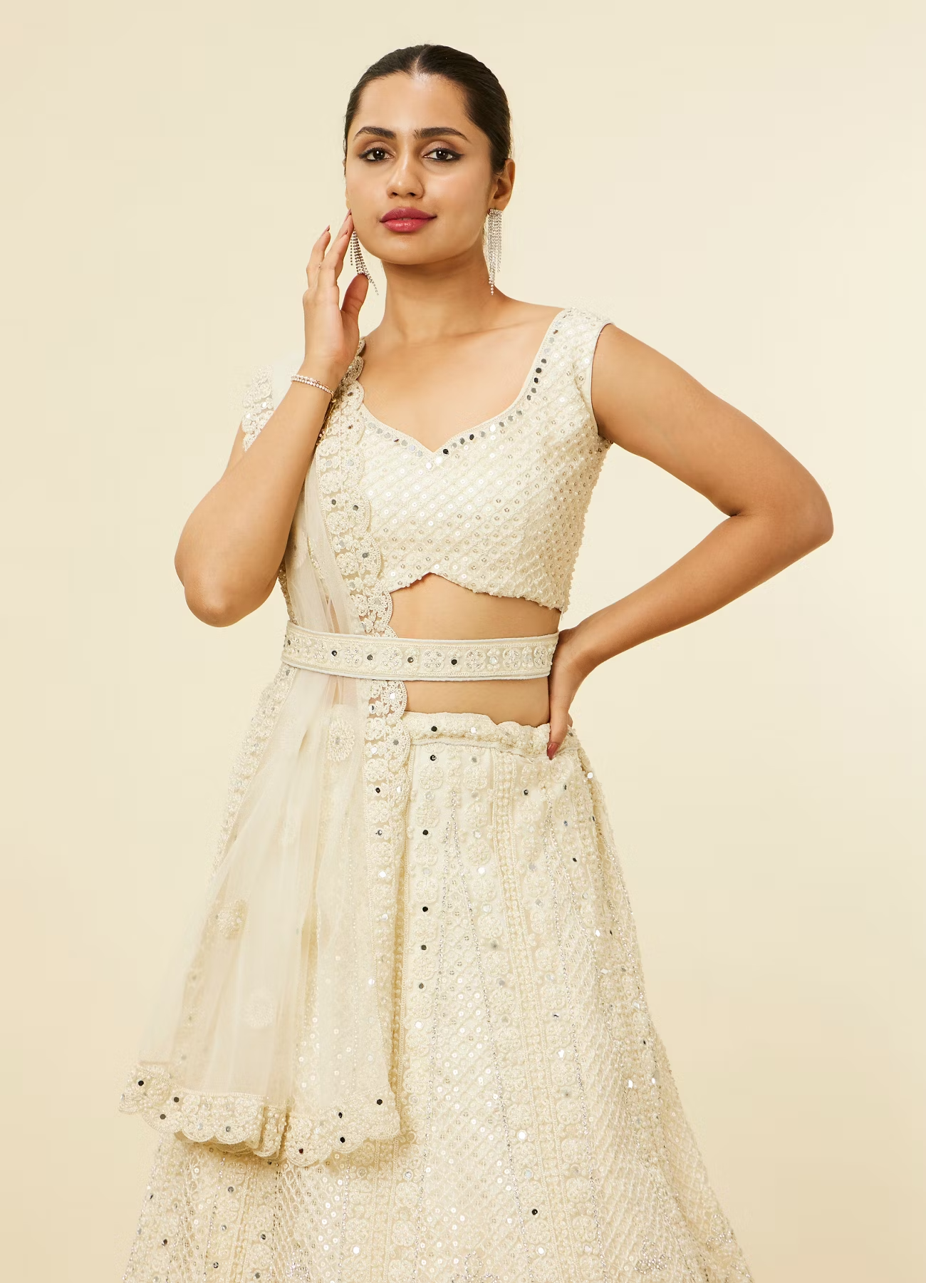Be the first to review “Dark Cream Floral Crop Top Lehenga with Mirror Work” Cancel reply