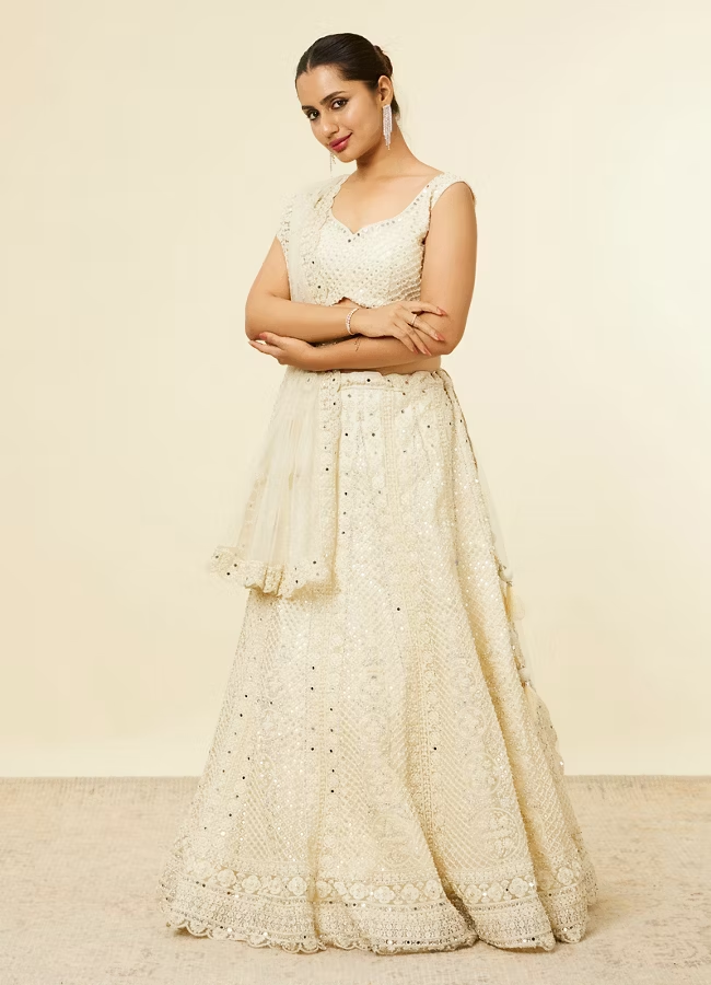 Dark Cream Floral Crop Top Lehenga with Mirror Work