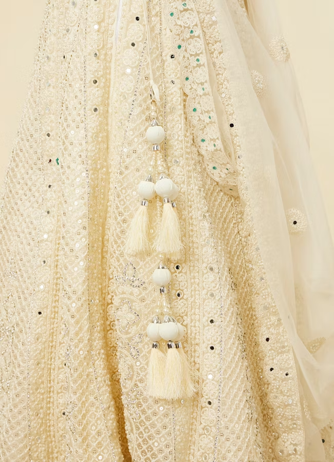 - DescriptionEmbrace elegance in this dark cream lehenga featuring floral patterns on the skirt and border of the net dupatta, enhanced with mirror work on the top. The ensemble is enhanced with potli trim latkan. Pair this ensemble with embellished silver accessories for a serene and elegant look.