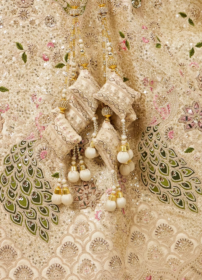 - DescriptionThis dark cream set features a beautifully designed skirt,adorned with a floral print, paisley and peacock motifs. The set includes a sweetheart neck blouse with sequin and mirror work, adding a touch of sparkle. The matching net dupatta completes the ensemble. Style it with minimal gold jewellery and sleek golden heels.
