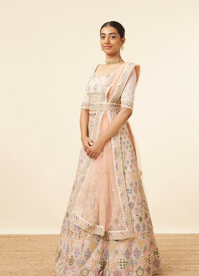 - DescriptionThis Dark Cream Multi coloured Lehenga is enriched with an all over colour block patterened design. The patterns are speckled with sequins and sheeny embroidery. Sparkling embellishments grace the border in a bringing a majestic appeal to the skirt and metallic trims with tassels decorate the waist tie.