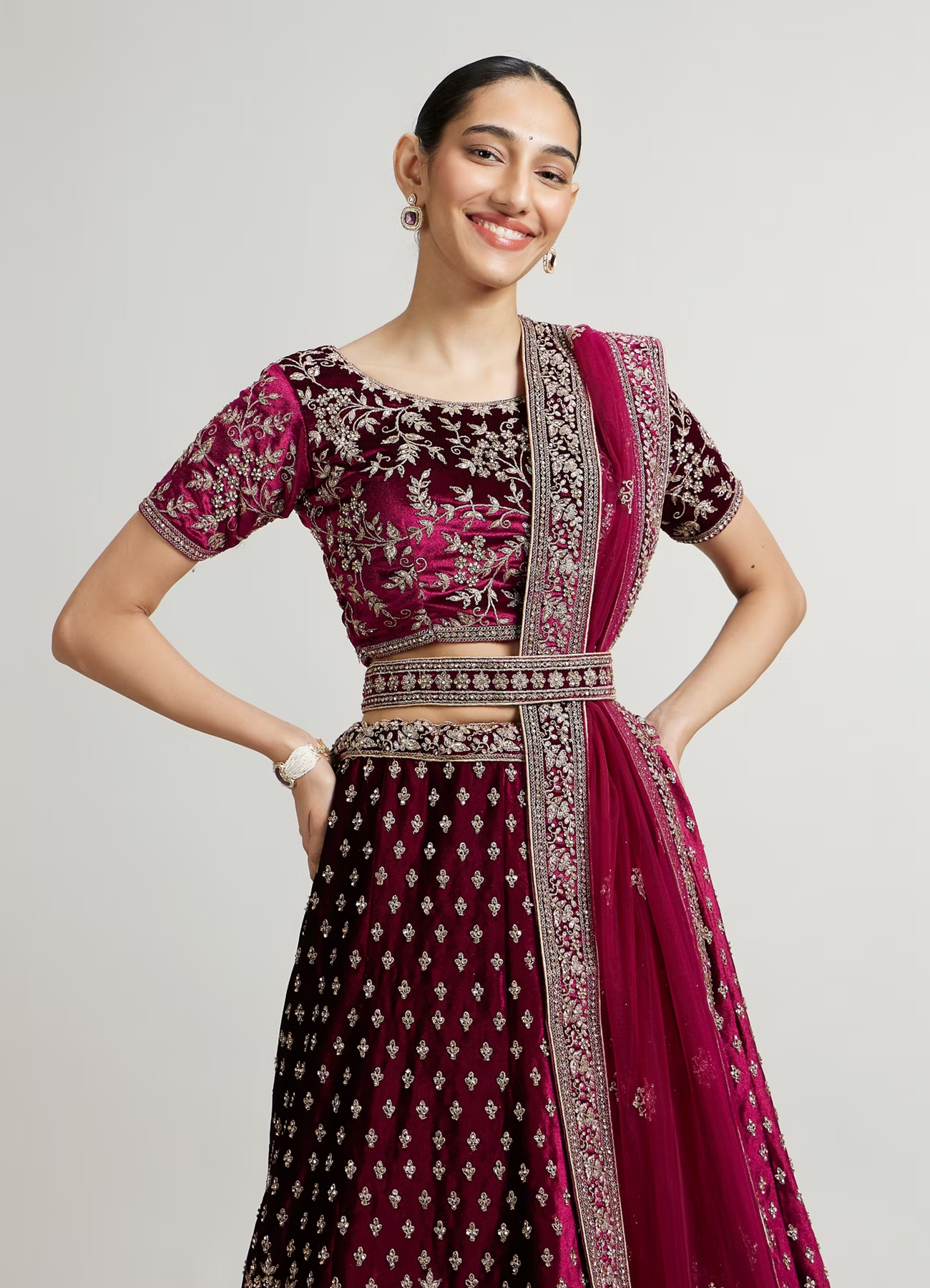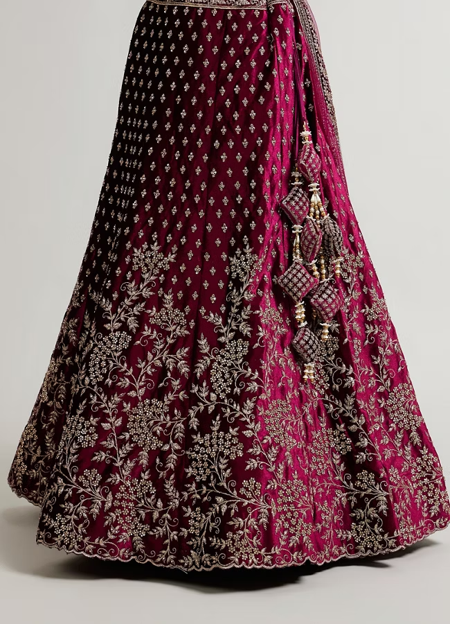 - DescriptionIntroducing our dark wine bel buti patterned lehenga, a stunning blend of tradition and elegance. Adorned with intricate bel buti motifs and exquisite aari embroidery, this lehenga captures the essence of sophistication. The rich dark wine hue adds a touch of drama, making it perfect for weddings and festive celebrations. Pair it with a contrasting embroidered blouse and statement jewelry to complete your look, ensuring you make a memorable impression at every special occasion.
