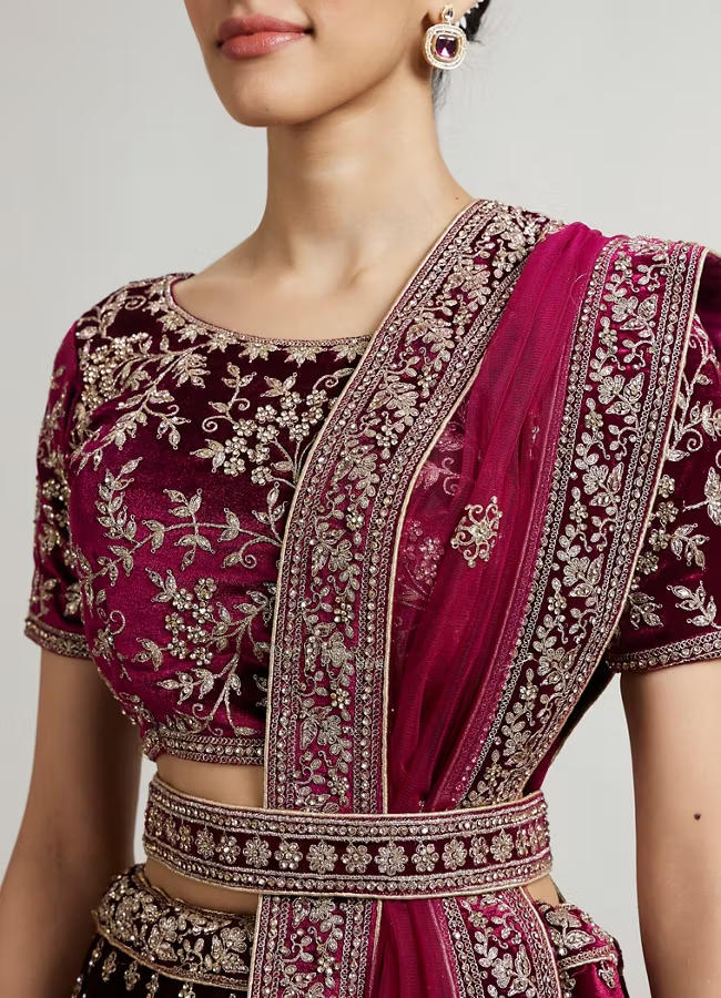 Dark Wine Bel Buti Patterned Lehenga with Aari Embroidery