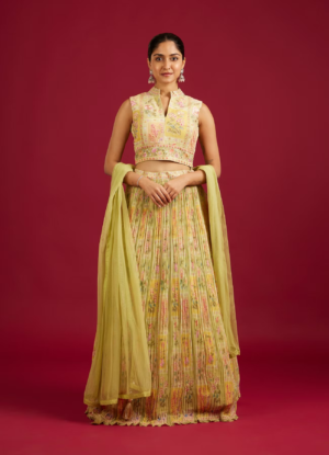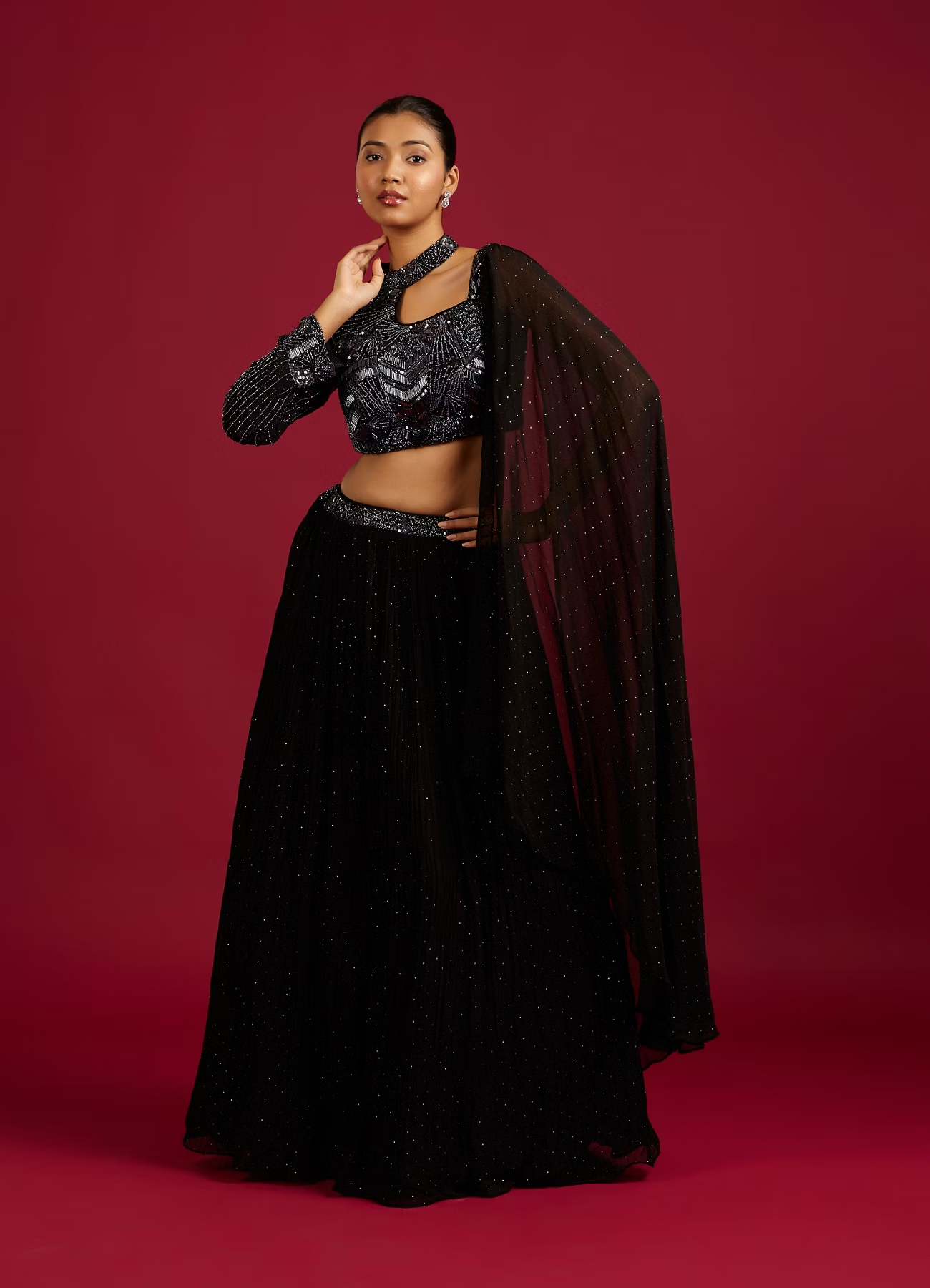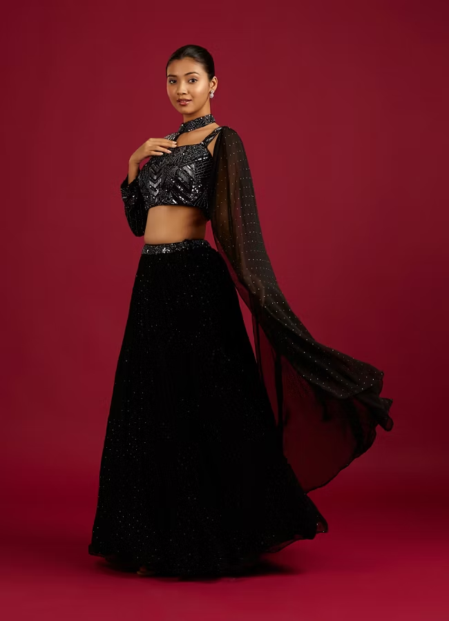• DescriptionTurn heads in this ebony black crop top lehenga, a stunning blend of glamour and grace. Adorned with intricate Cutdana and sequin work, it shimmers with every move, while delicate rhinestones add a hint of sparkle. Perfect for receptions or evening soirees, style it with statement chandelier earrings, sleek stilettos, and a bold red lip for a show-stopping look.