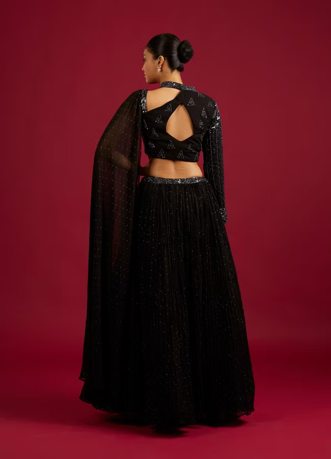 Ebony Black Cutdana And Sequin Work Crop Top Lehenga with Rhinestones