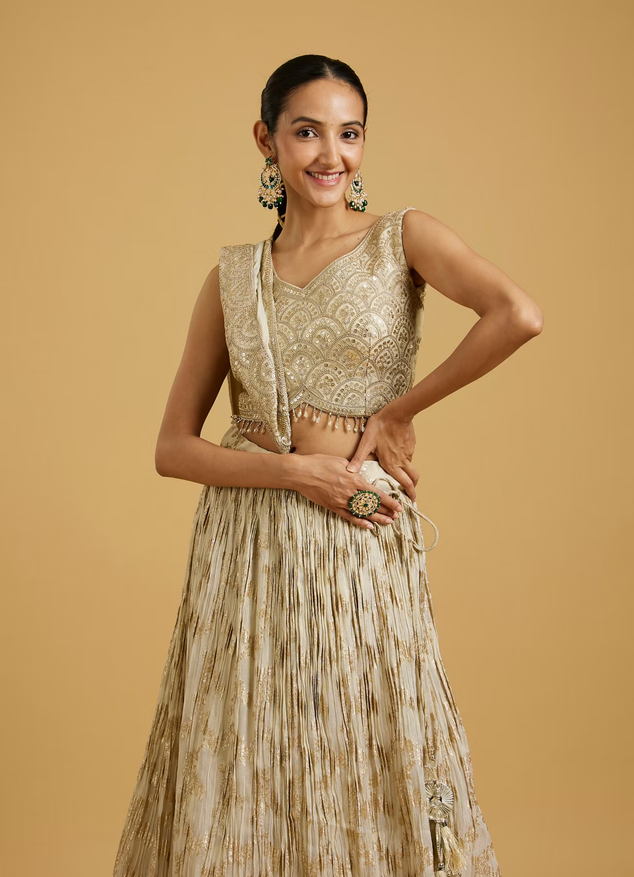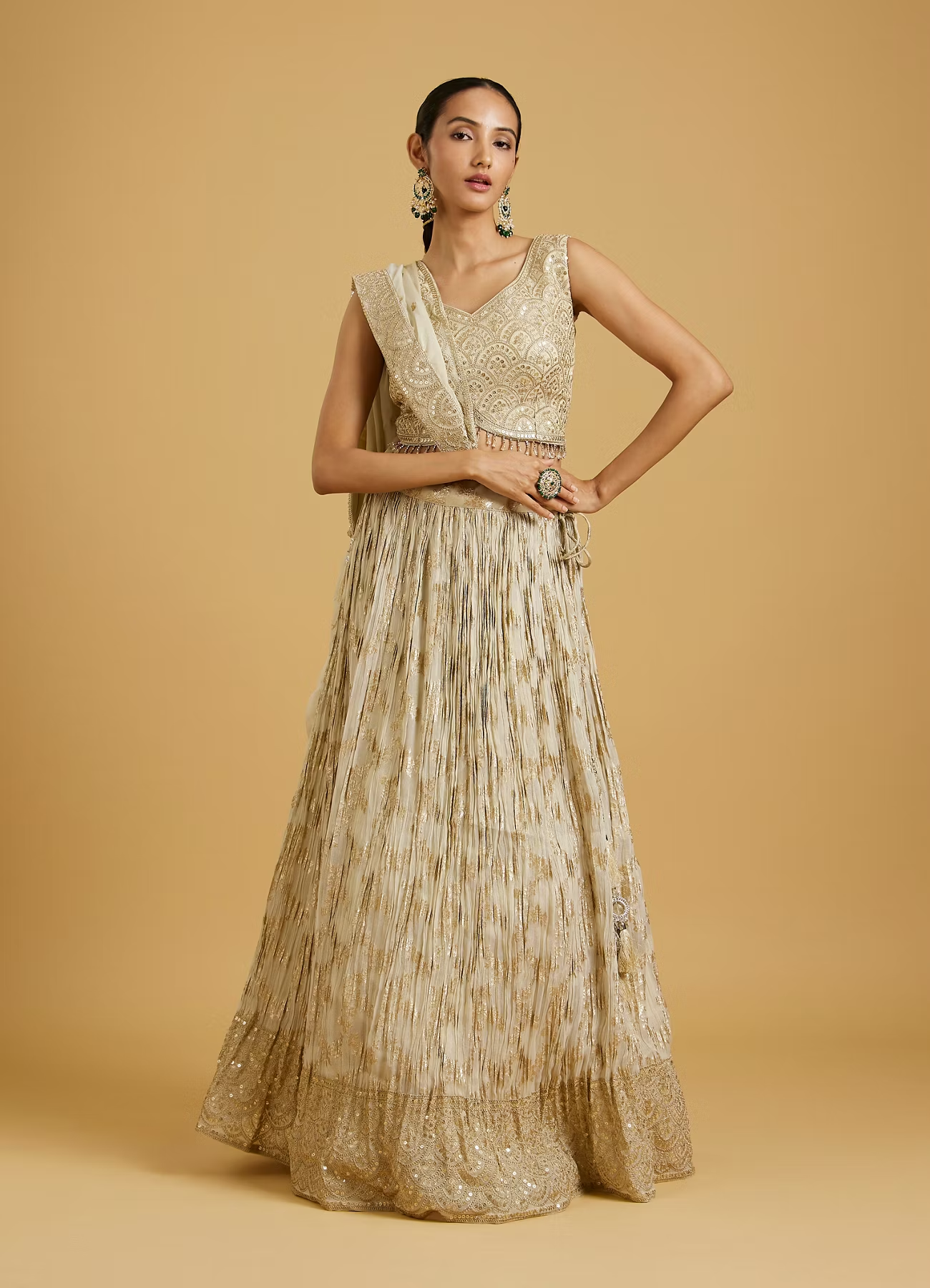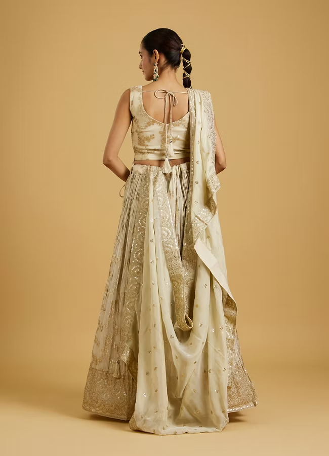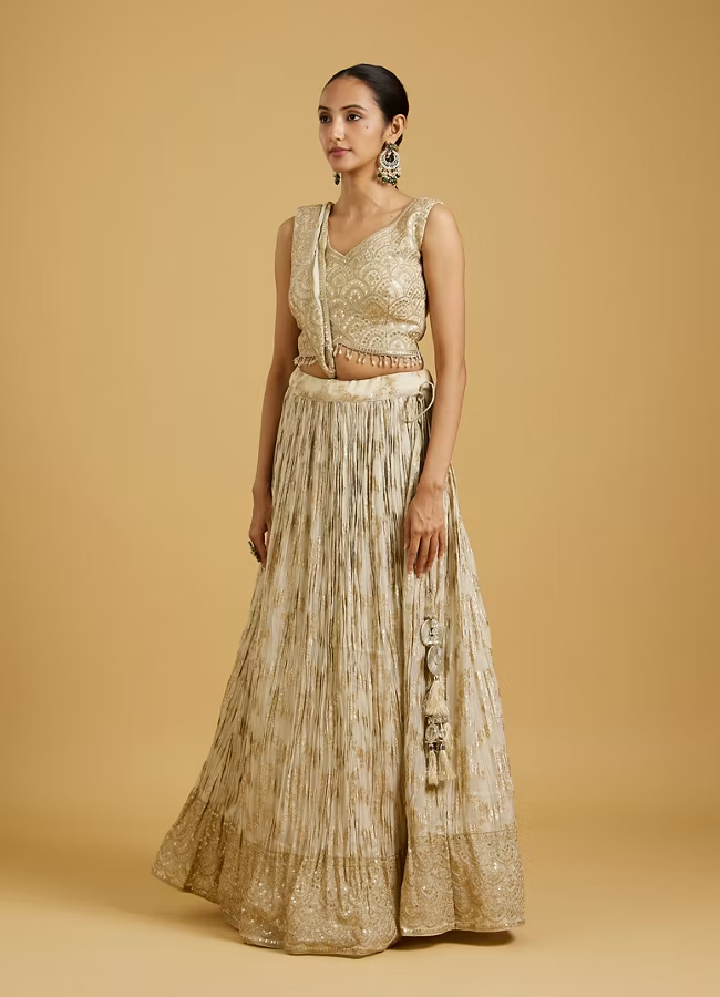 Grace any occasion draped in glamour with this beautiful Beige Extravaganza Lehenga. The rich art silk fabric lends an air of regality, while the skirt-top-dupatta combination ensures you have all elements of traditional elegance wrapped up in one phenomenal ensemble. Perfect for all grand celebrations.