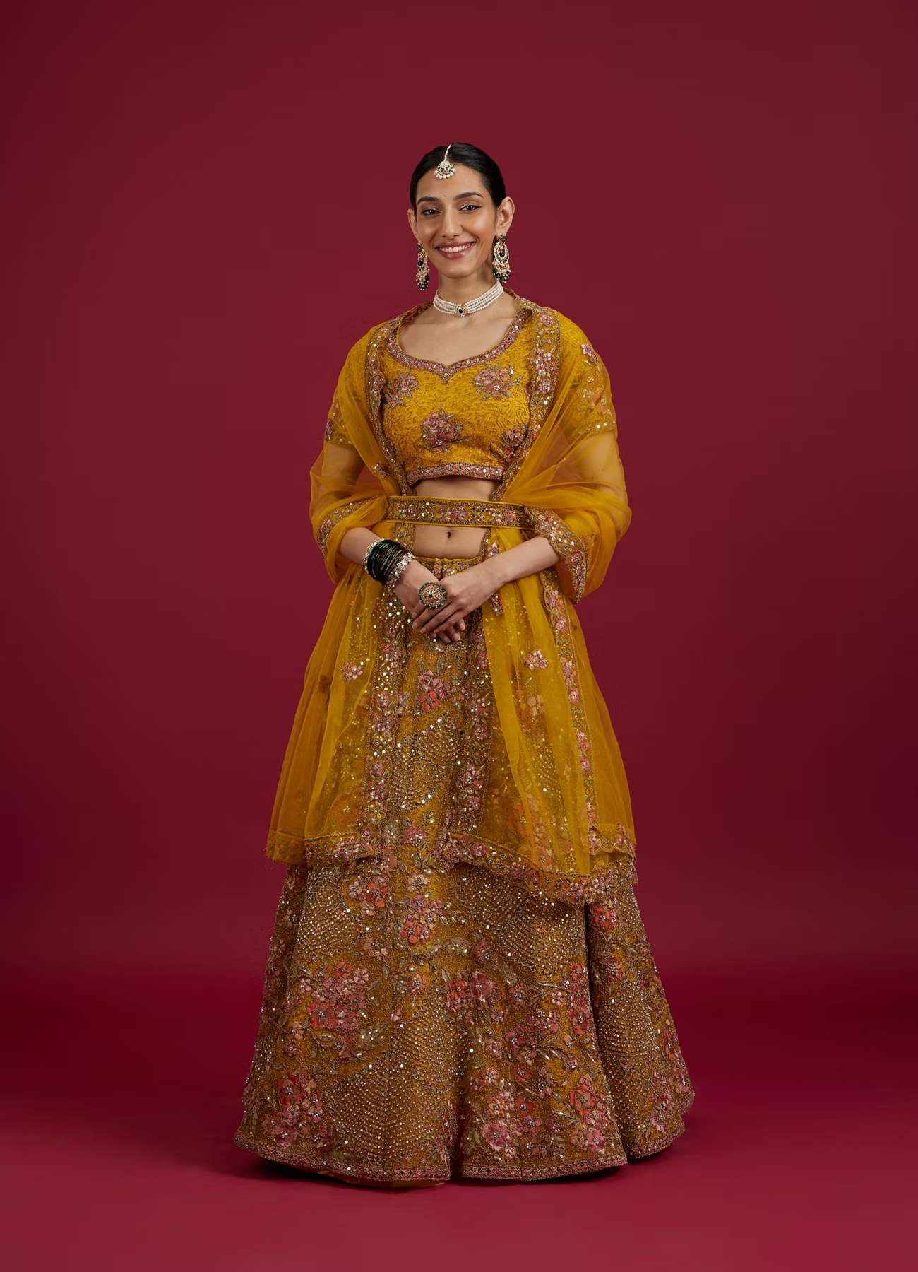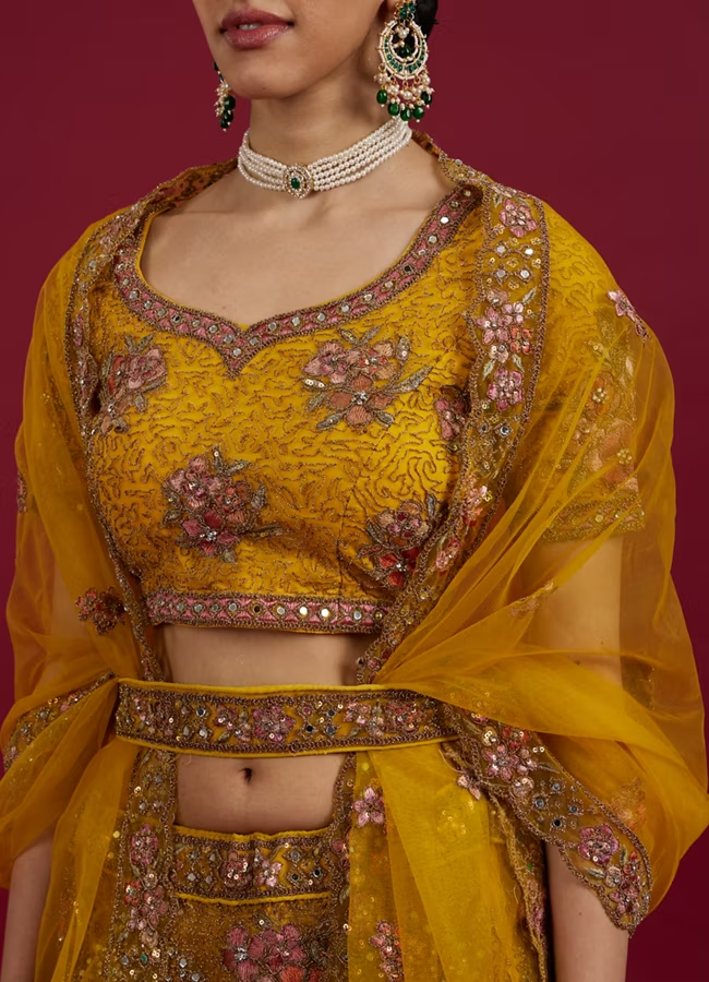 Embrace the festive cheer with this Elegant Mustard Yellow Lehenga. The ensemble comes with a lehenga, blouse, dupatta, latkan, and a belt, all crafted from high-quality net. Perfect for any celebratory occasion, its vibrant yellow color is sure to make a fashion statement.