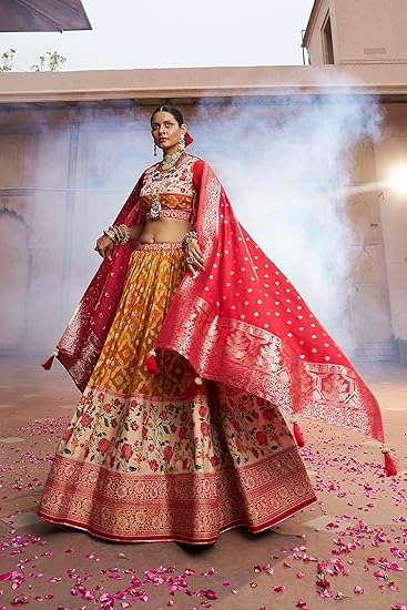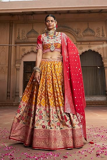 - Lehenga Color :- Yellowish Orange || Blouse Colour :- Red Wine || Dupatta Colour :- Red Wine