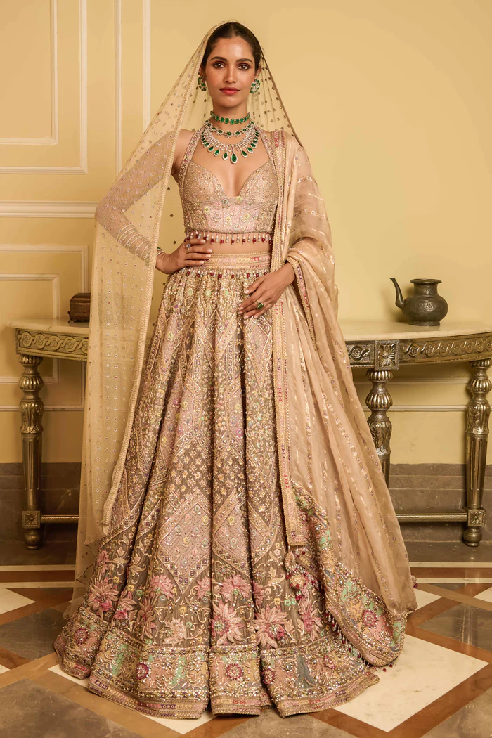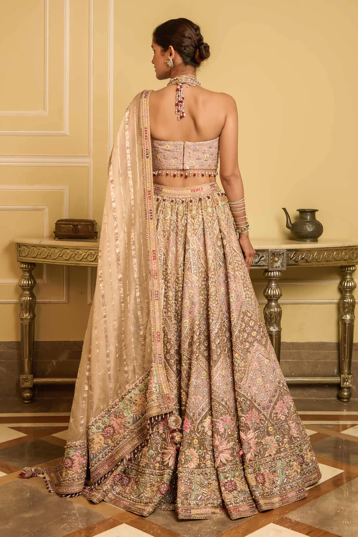 - This is our hand-embroidered lehenga that features a multicolor mosaic pattern on pure silk-tissue fabric. It is studded with crystals all over and is to be worn with a matching contemporary halter blouse in silk tissue. A stripe tissue dupatta with embroidered borders and bead hangings, along with a crystal-encrusted tulle veil complete the ensemble