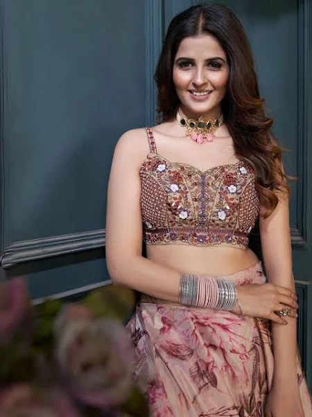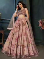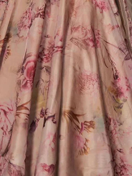 Beige and pink embroidered ready to wear blouse, has a square neck, sleeveless, beige and pink printed ready to wear lehenga, flared hem