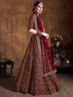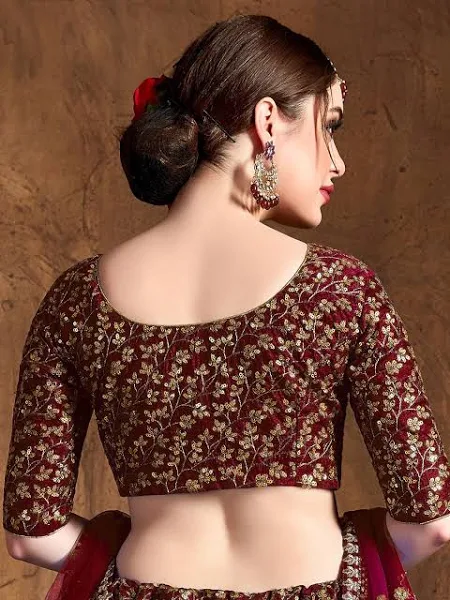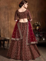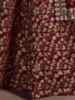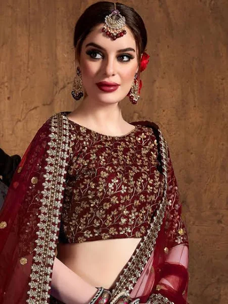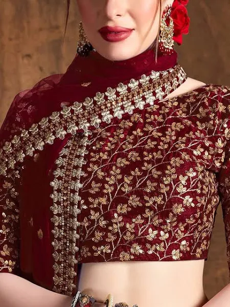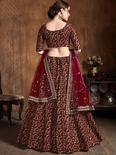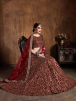 Maroon and gold-toned embroidered lehenga choli with dupatta,