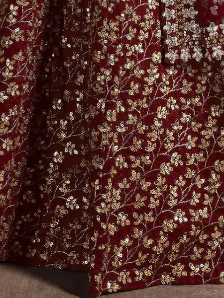 Maroon and gold-toned embroidered semi-stitched lehenga, flared hem