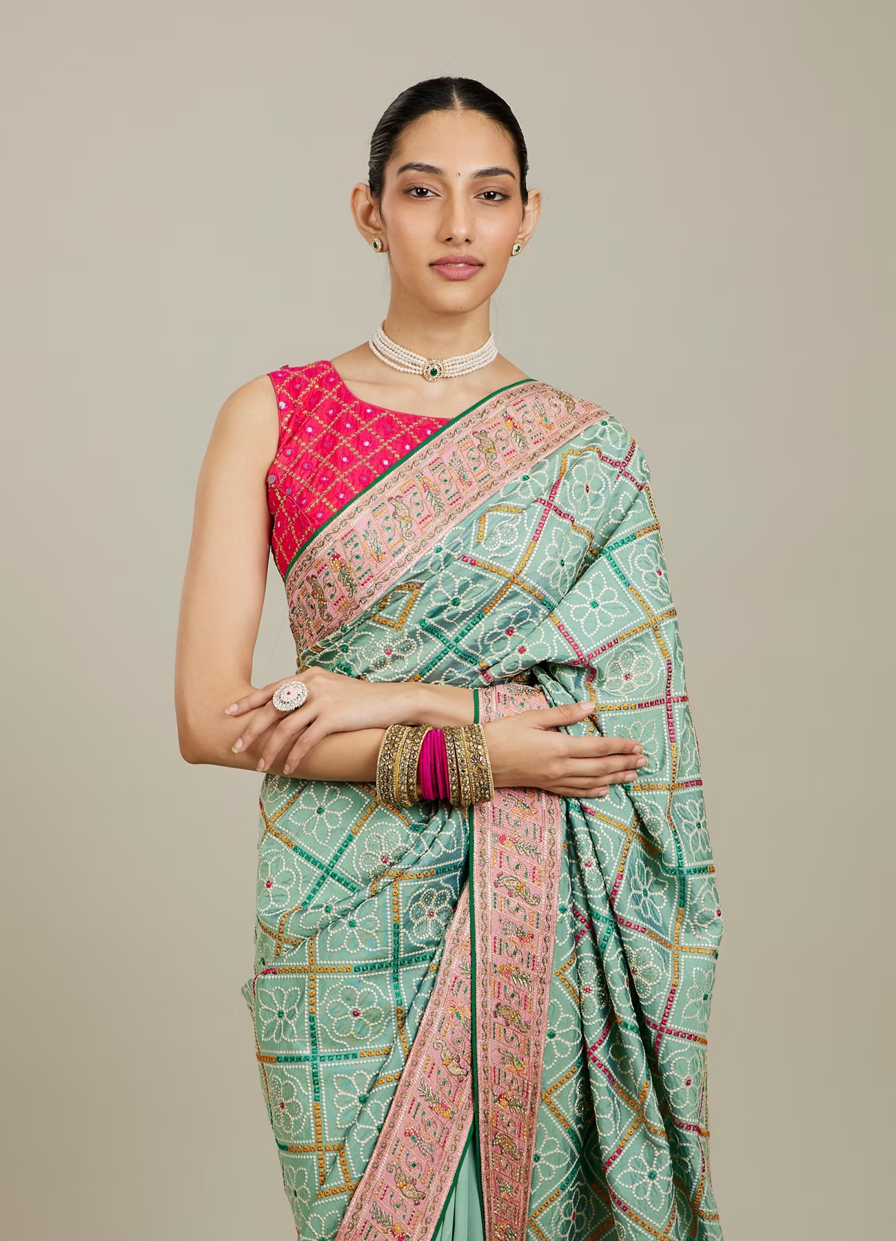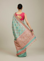 - DescriptionDazzle at your next festive occasion with this sea-green saree. The vibrant hues augmented by an exquisite pink border add charm to the ensemble. Expertly crafted from premium silk fabric for a soft and comforting feel. This saree promises an elegant and luxurious look for any event.