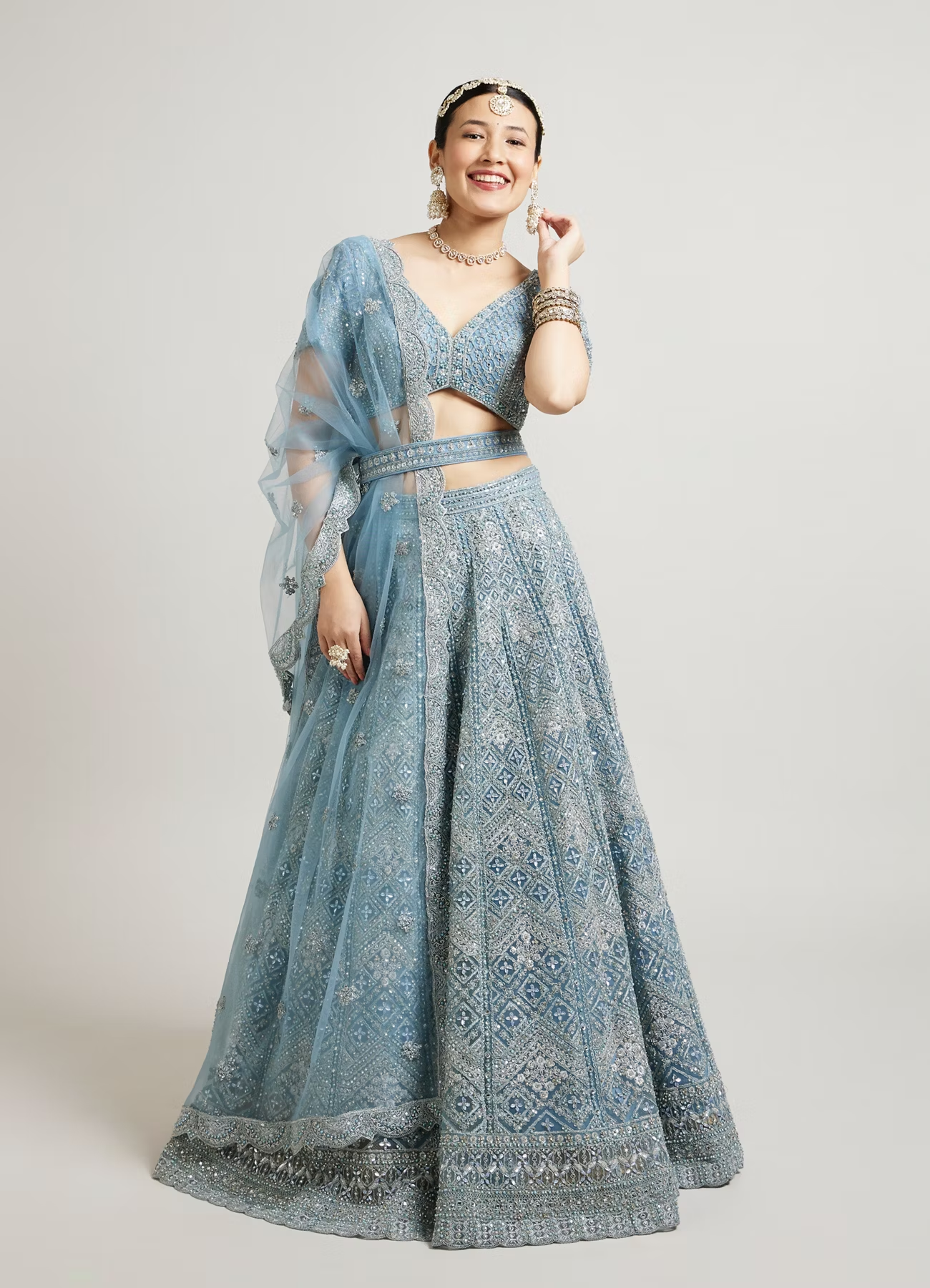 - DescriptionStep into the spotlight with this exquisite blue bridal lehenga, meticulously crafted from delicate net fabric. The lehenga is adorned with intricate hand embroidery, shimmering mirror work, dazzling moti accents, and sequins, creating a look that’s both regal and festive. Perfect for weddings or grand celebrations, this ensemble includes a beautifully detailed lehenga, a matching blouse, a stylish latkan, an elegant belt, and a graceful dupatta, adding layers of sophistication to your ensemble. Whether you’re the bride or a wedding attendee, this lehenga is sure to leave an unforgettable impression.
