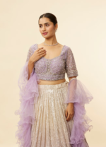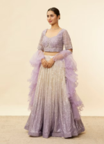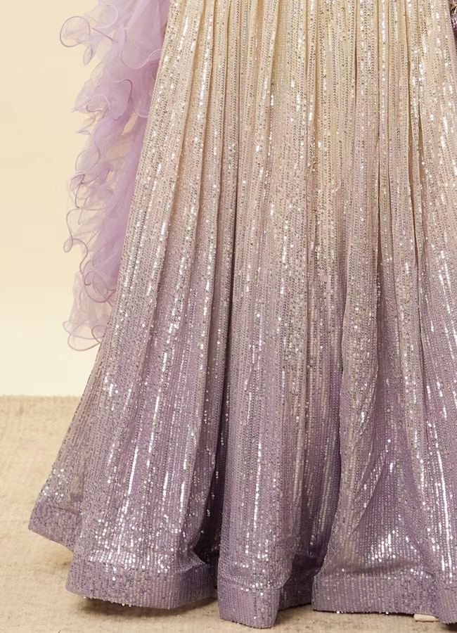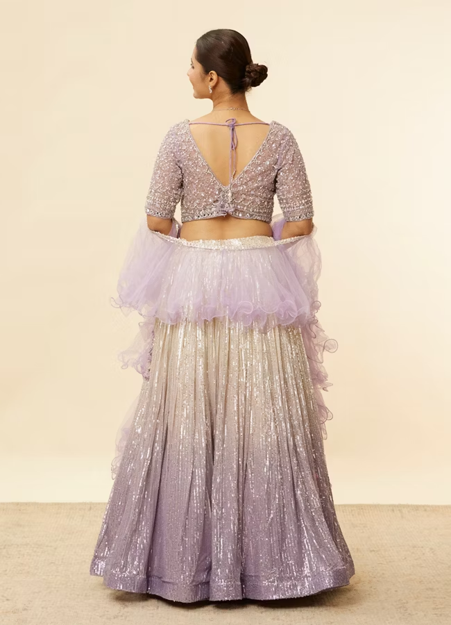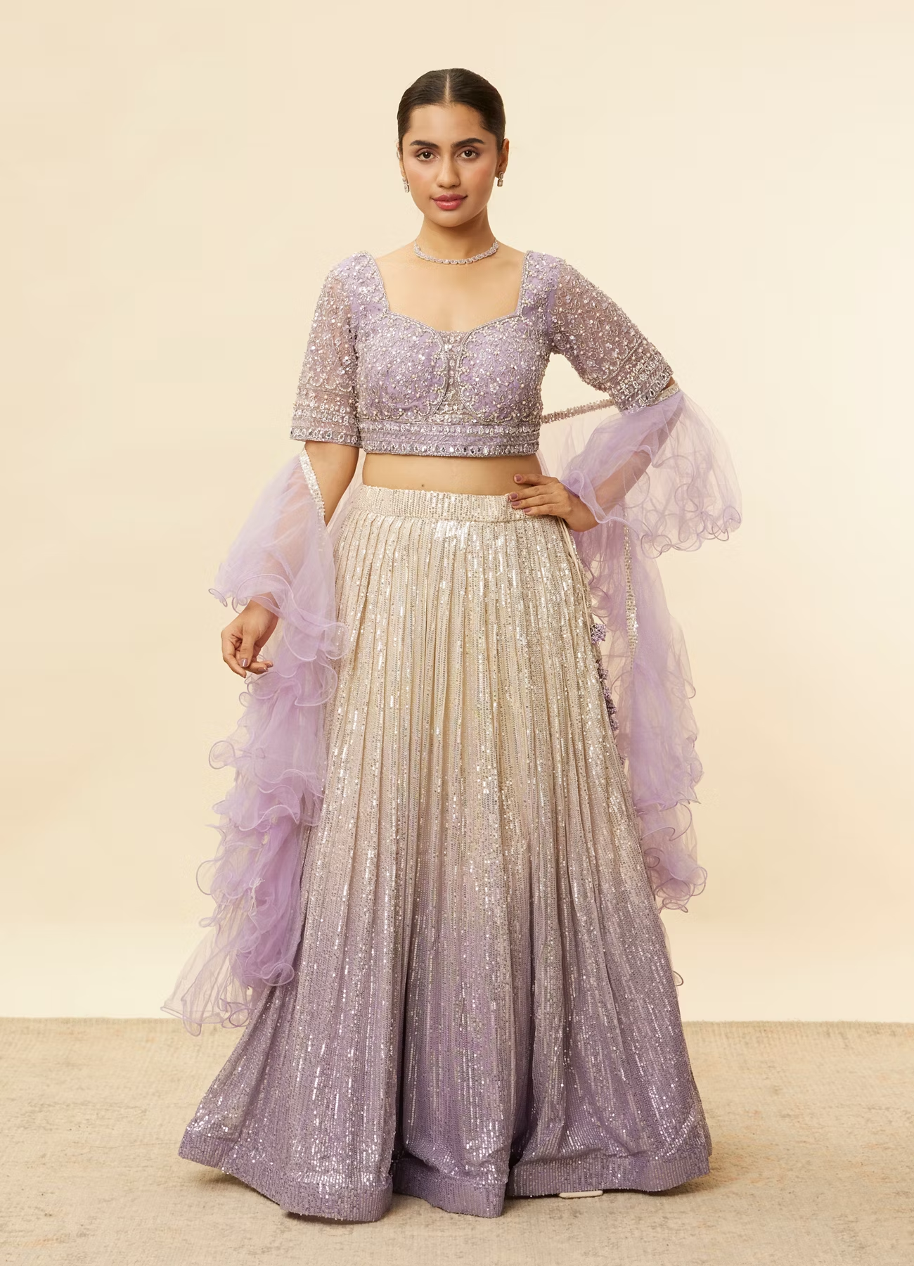 - DescriptionThis lavender purple ombre sequinned Lehenga is perfect for cocktail parties or celebrations. The blouse is adorned with sequinned bel buti embroidery, complementing the ombre skirt which is lavishly covered in sequin work. The set is completed with a matching ruffled stole with sequin work border, creating an elegant and cohesive look. Style with statement earrings and stilettos.