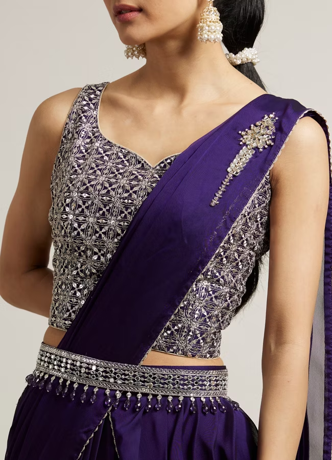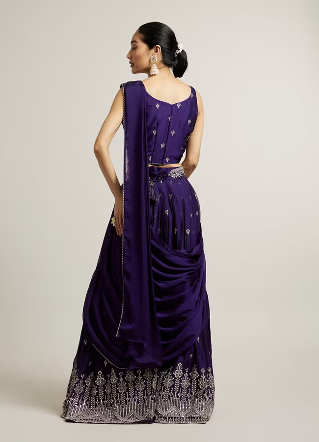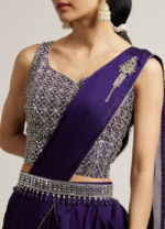 Bask in the brilliance of this Festive Purple Georgette Lehenga, perfect for Haldi or other wedding festivities. The ensemble includes a top, dupatta, belt, and lehenga, each piece exuding a royal allure. The vibrant shade of deep purple adds an enigmatic charm, making it a truly unmissable piece. Suitable for weddings or festivals, this outfit is sure to add sparkle to your celebrations.