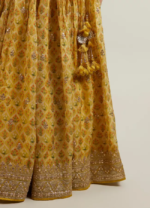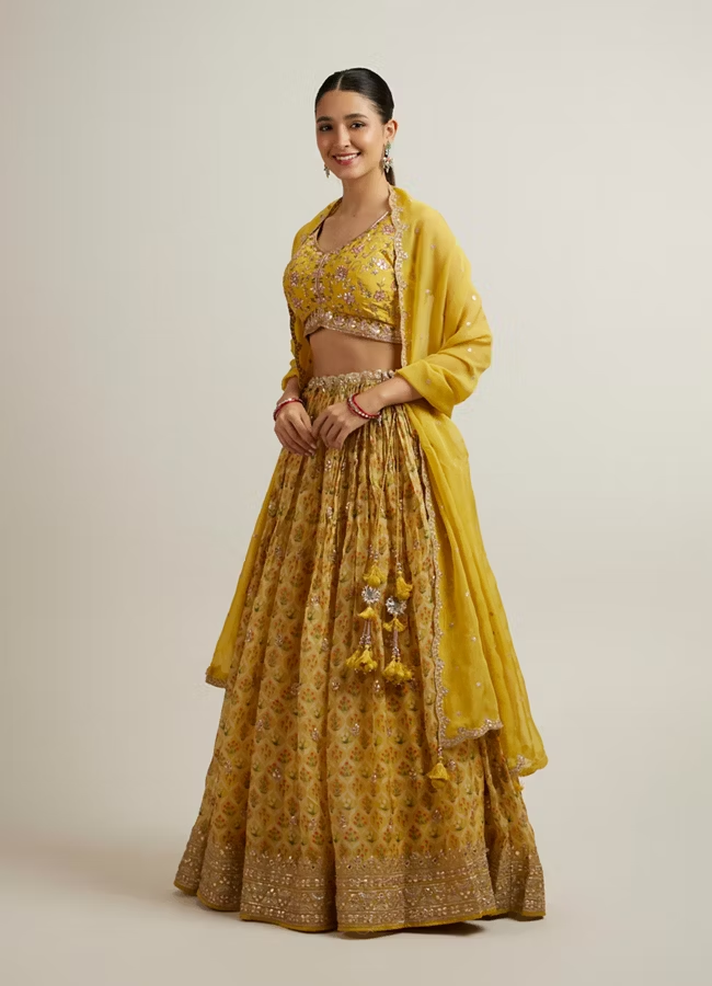 - DescriptionExperience the allure of yellow with this radiant Lehenga. Made from premium organza fabric, it’s highlighted with intricate hand embroidery, thread work, and eye-catching zari details. Glittering sequin and cutdana work with a dash of zardozi amplifies its grandeur. Complete with a matching top and dupatta, this ensemble is perfect for engagement parties, haldi ceremonies, or wedding receptions.