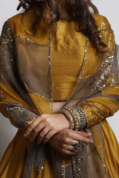 Burnt gold & grey dupion silk lehenga with heavily embroidered sleeves. Comes with a padded blouse and an organza dupatta having dual coloured patchwork, including zari and sequins hand embroidered chakra motifs .