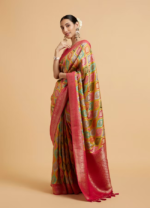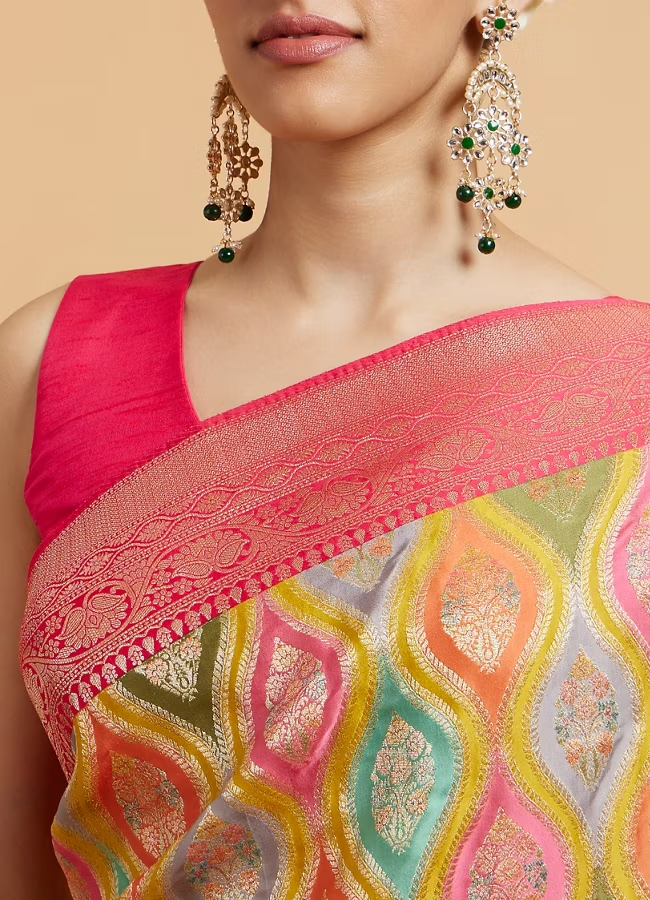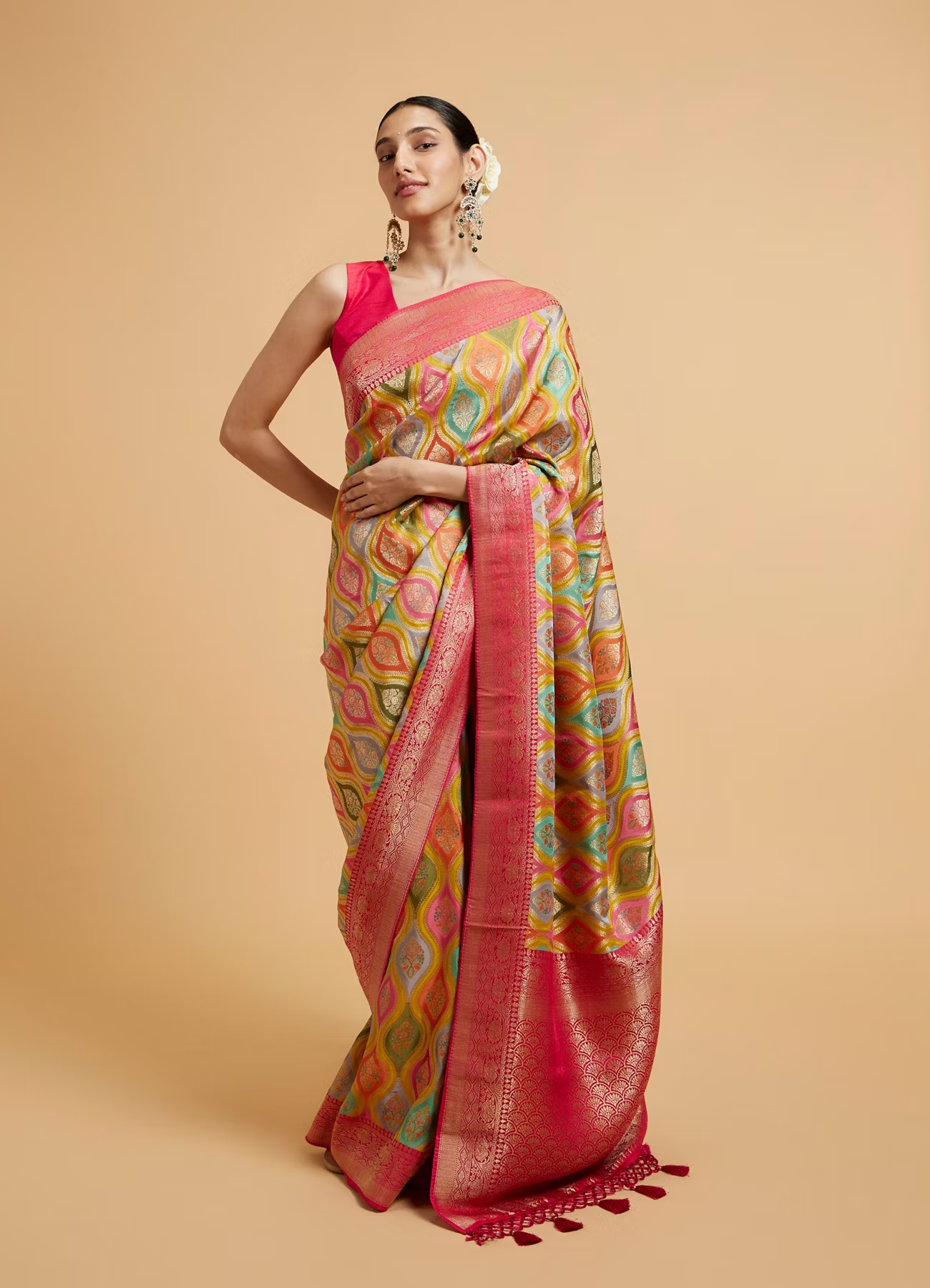 - DescriptionStep into style with our green and rani ogee patterned saree, featuring elegant scallop borders and playful tassel trims. Crafted from soft, flowing fabric, this saree offers a comfortable drape, perfect for any occasion. For a chic look, pair it with a fitted blouse and statement earrings, allowing the unique patterns and tassels to enhance your overall charm.
