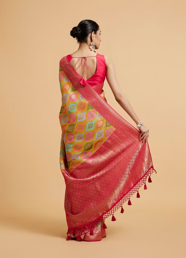 Green and Rani Ogee Patterned Saree with Scallop Borders & Tassel Trims
